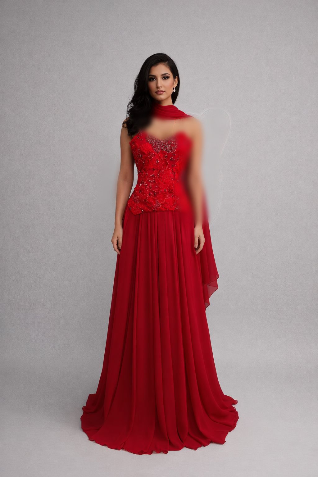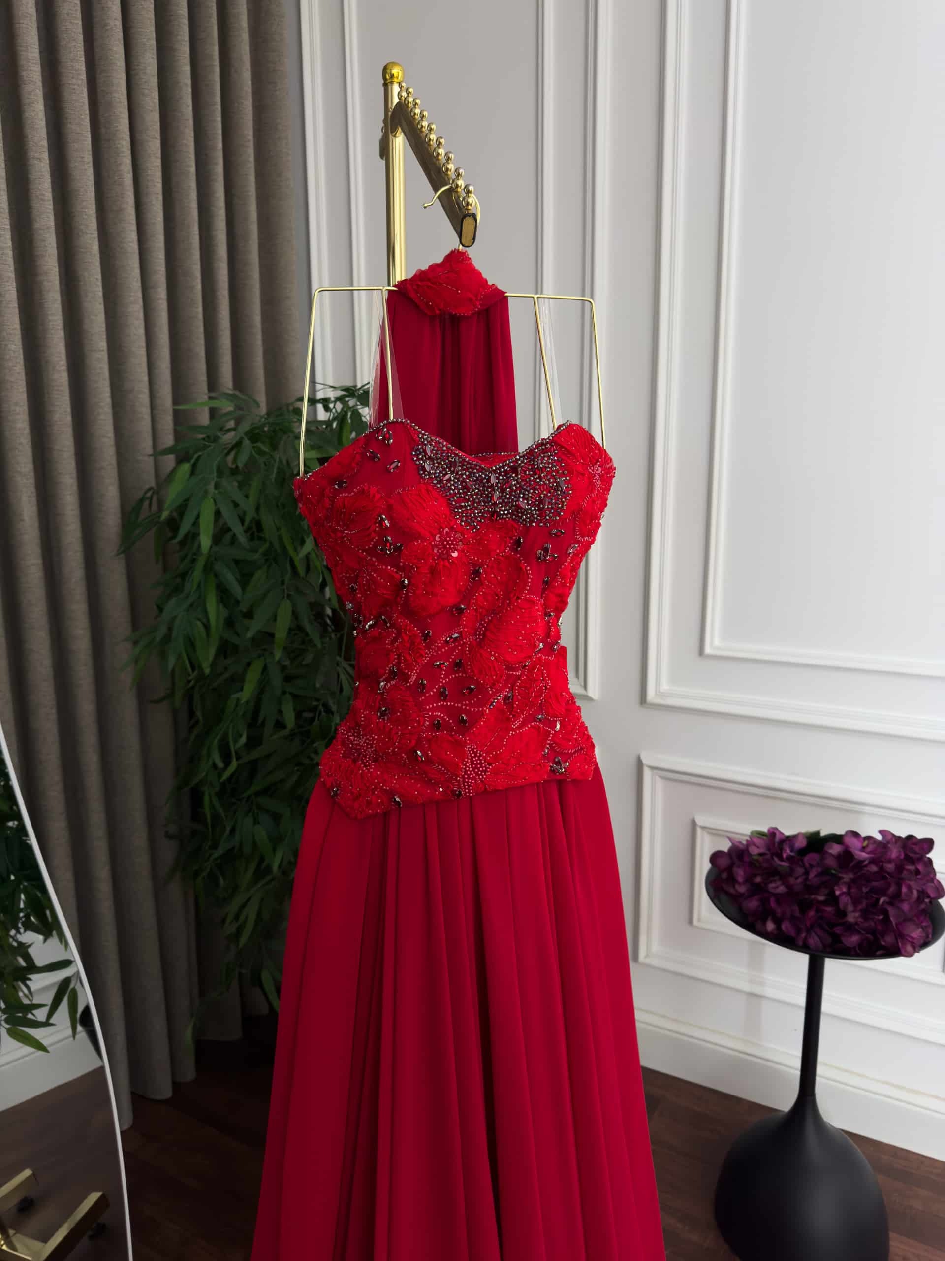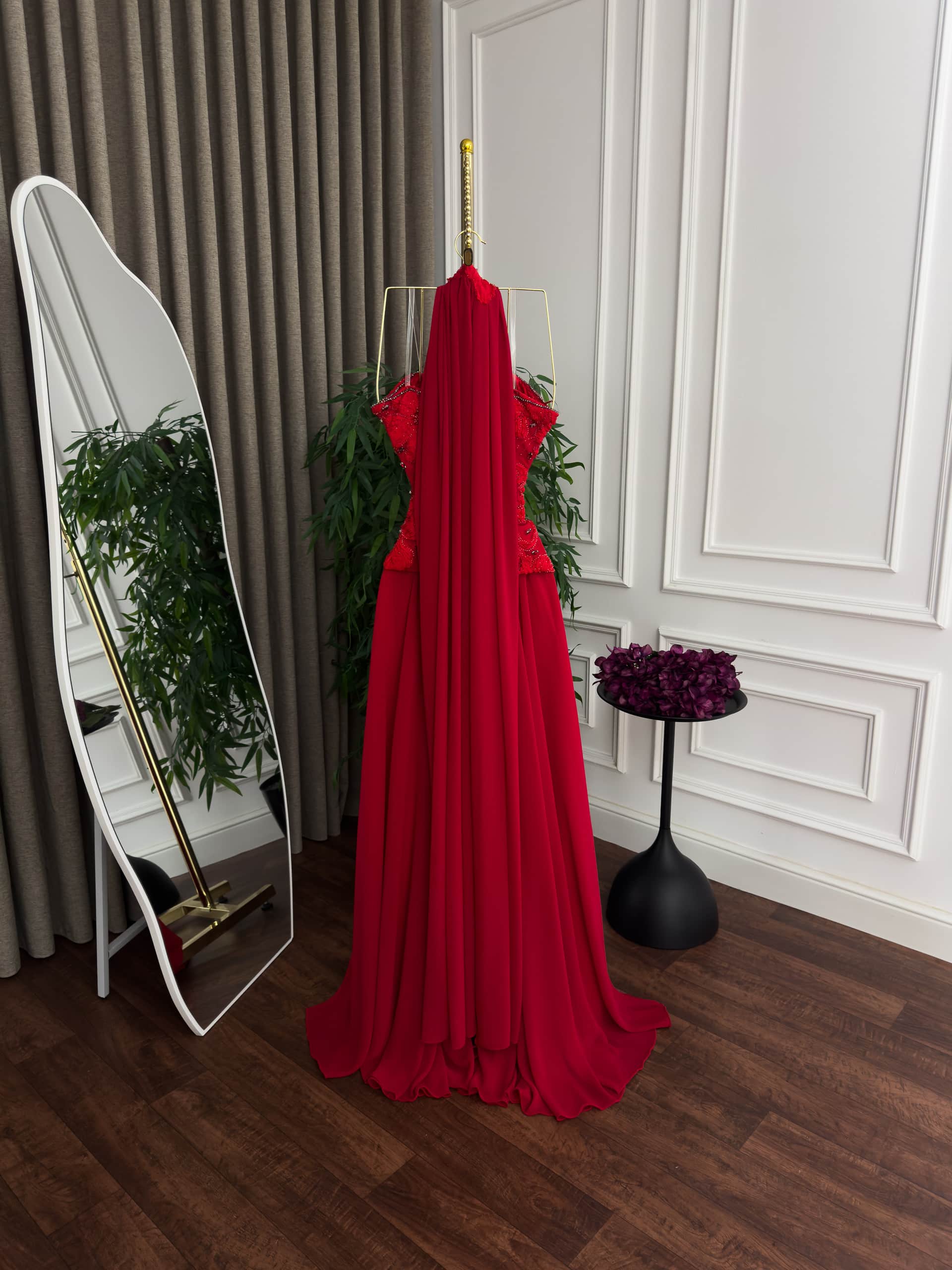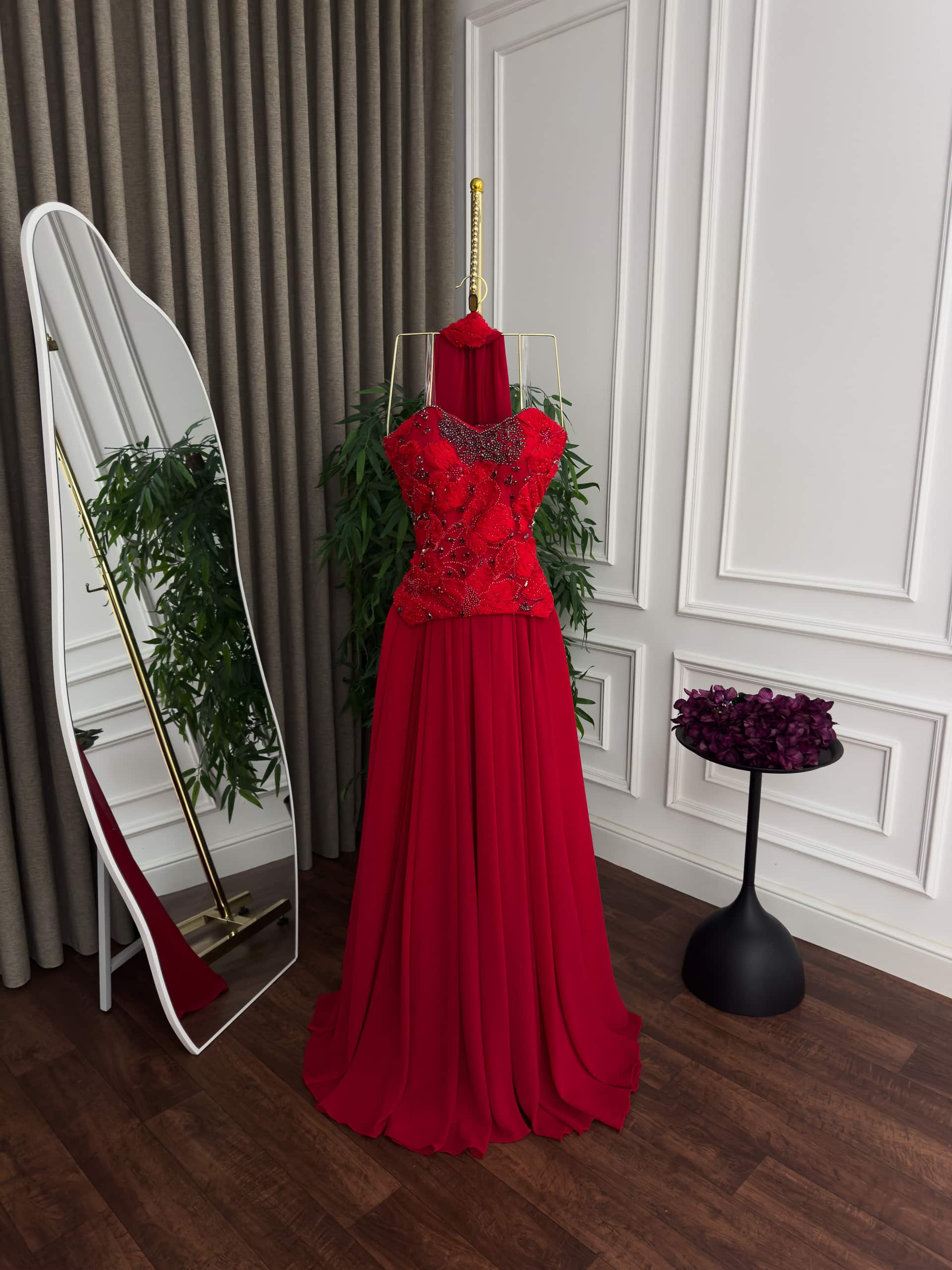فستان سهرة أحمر فخم مطرز بتفاصيل أنثوية