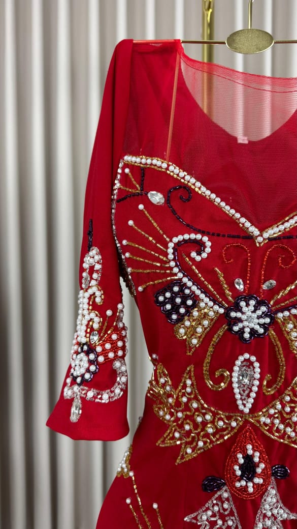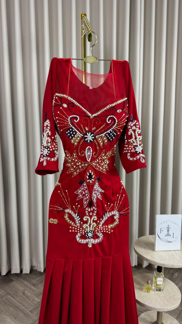فستان سهرة أحمر مطرز من روزيتا | فخامة تأسر الأنظار وأناقة سعودية فريدة