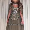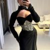 الجزء العلوي من الفستان مزخرف بأحجار لامعة تنعكس الضوء وتبرز جمال القوام بطريقة أنثوية وفاخرة. هذه التفاصيل تجعل الفستان مثاليًا لإضفاء لمسة من التميز في أي مناسبة خاصة.