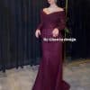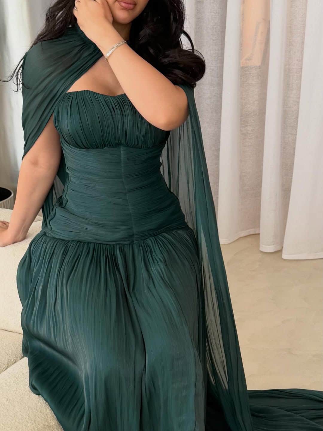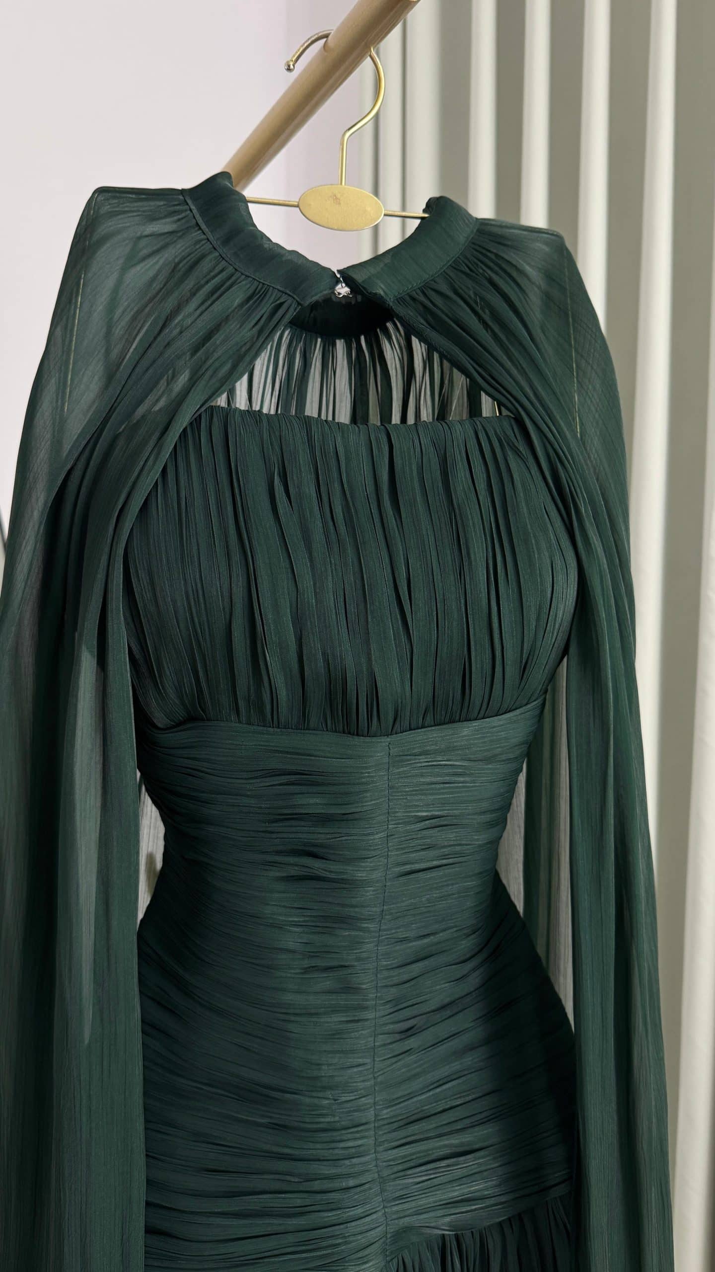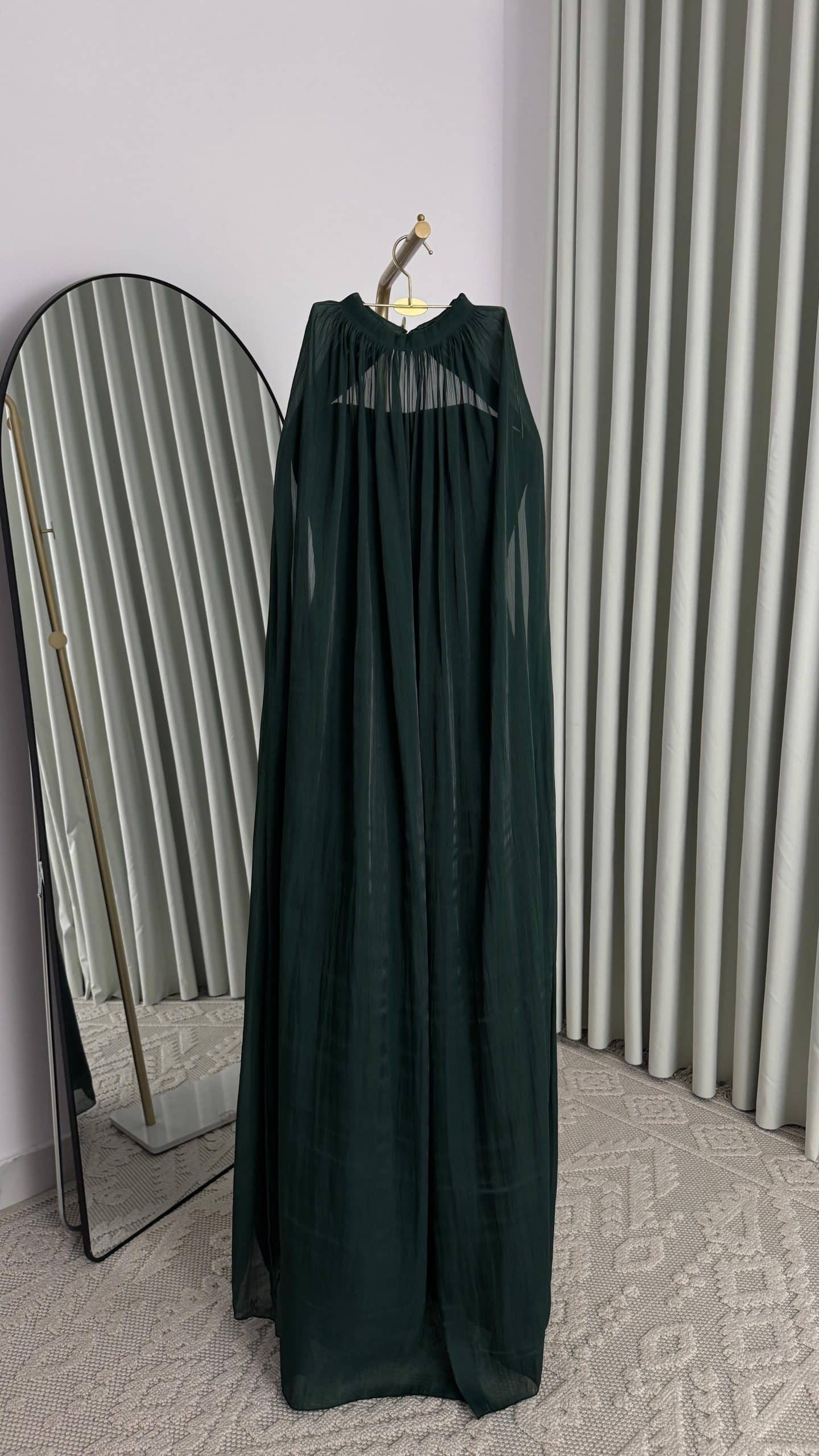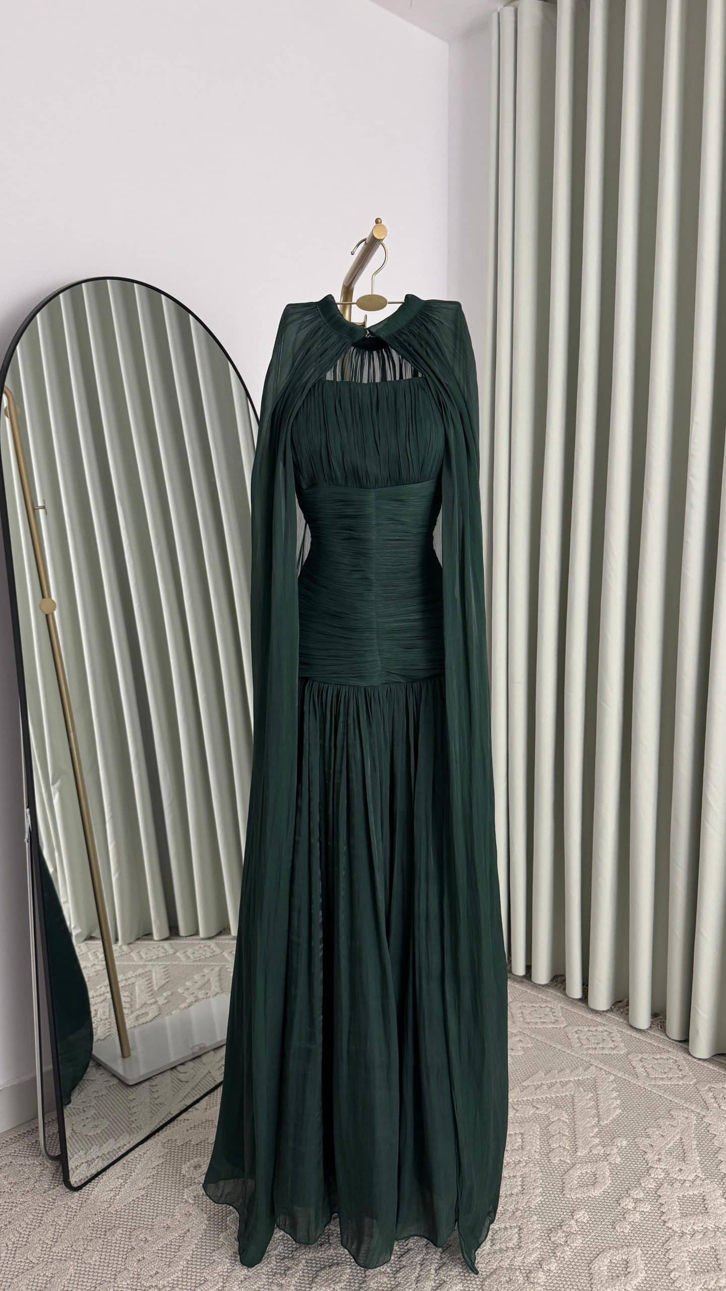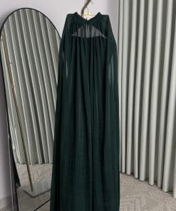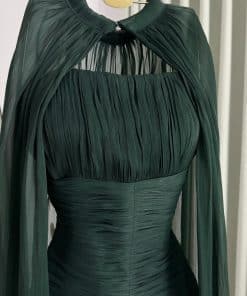 فستان سهرة أخضر داكن فاخر بكاب طويل وتصميم راقٍ