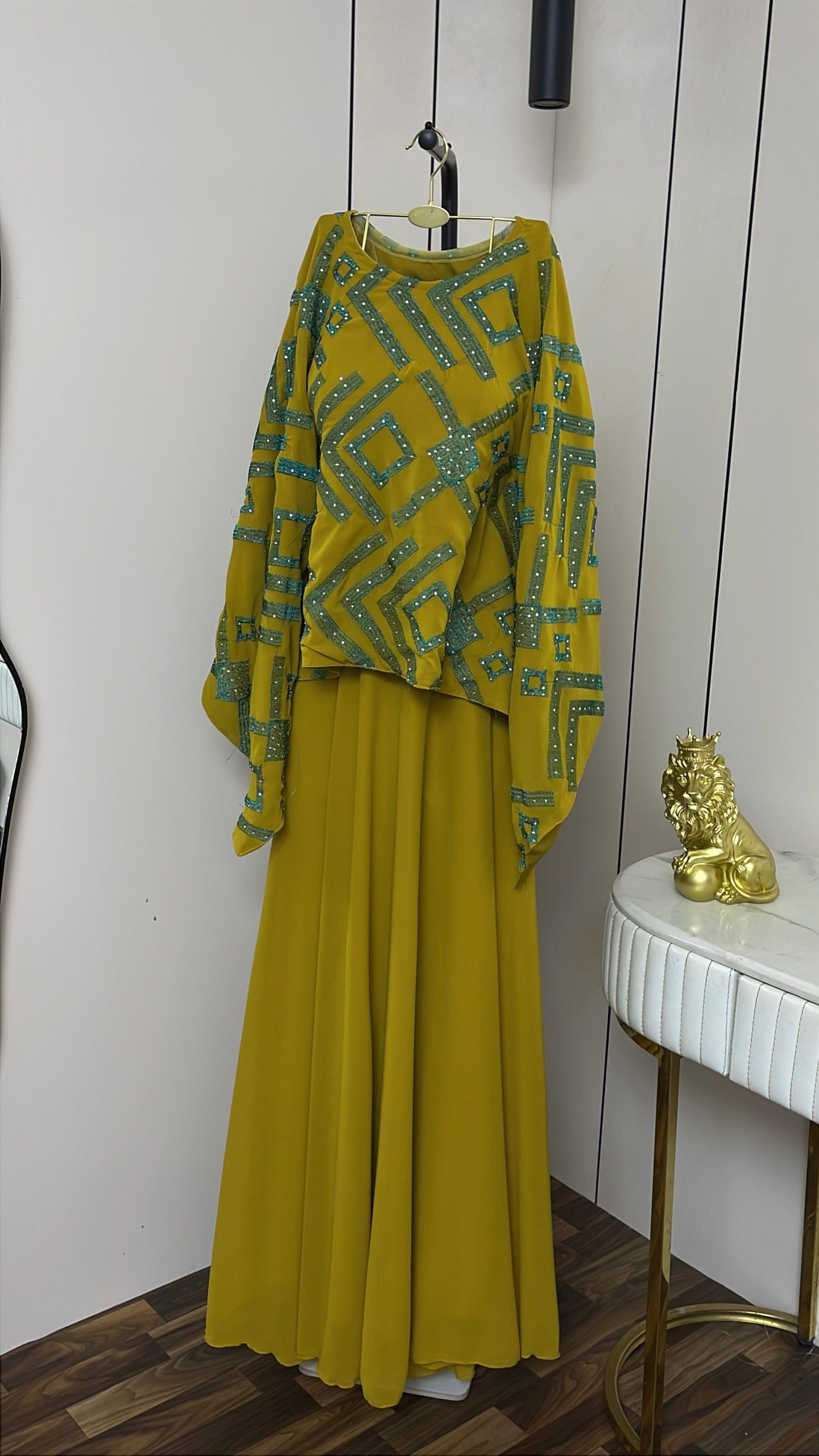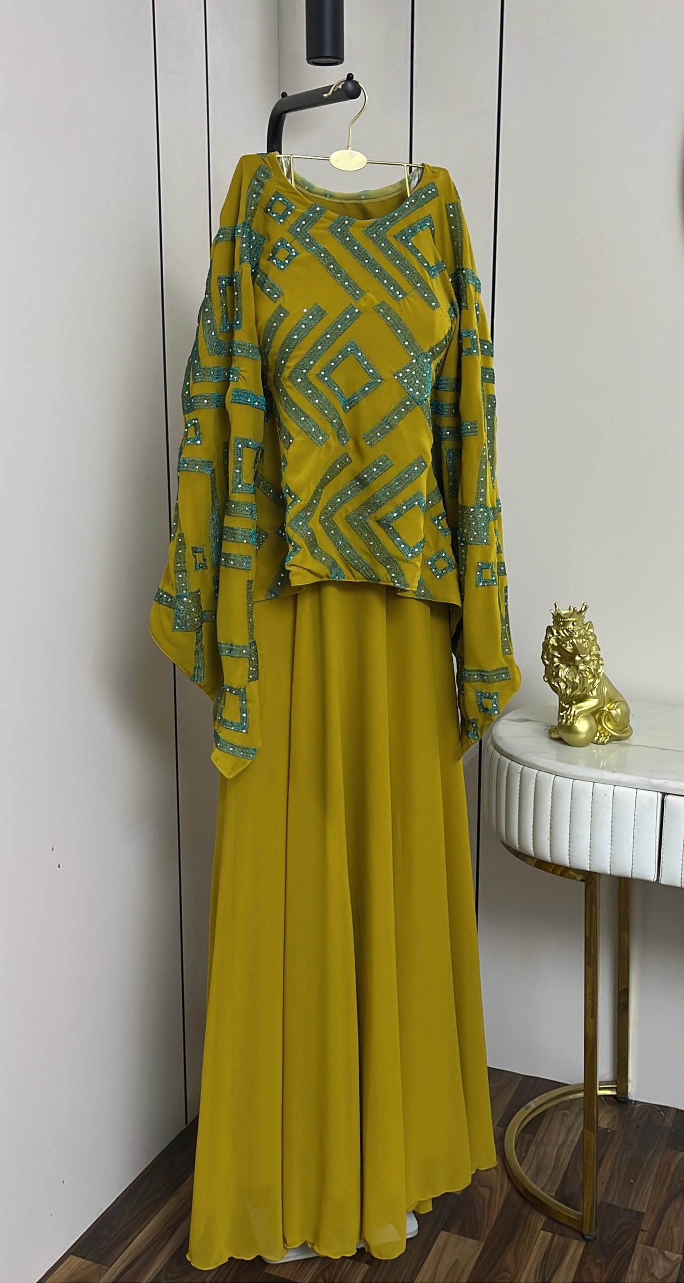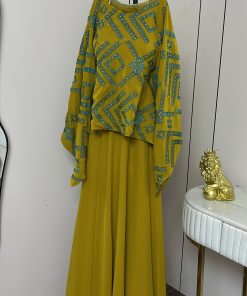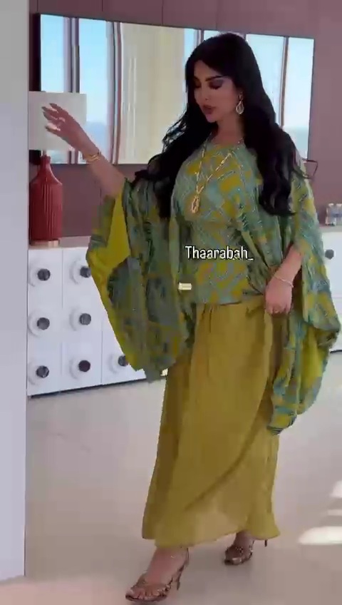يأتي الفستان بطبقة علوية واسعة بأكمام طويلة تمنح راحة وأناقة، مع تنورة طويلة انسيابية تضفي حركة ناعمة وأنوثة راقية. خامته خفيفة وعالية الجودة، ما يجعله خيارًا مثاليًا للسهرات والمناسبات الخاصة التي تتطلب إطلالة مميزة وغير تقليدية.