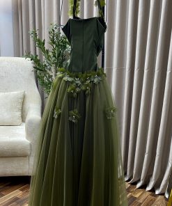الفستان يأتي بلون أخضر زيتوني رائع يعكس الأناقة الطبيعية، ويمنحكِ إطلالة راقية وجذابة. الجزء العلوي من الفستان يأتي بتصميم بسيط، بينما تزينه الزهور المنقوشة التي تضفي لمسة من التفرد والأنوثة. أما التنورة المصممة من التول، فتنساب برشاقة على الجسم لتضيف لمسة من الرقة والجمال.