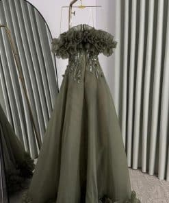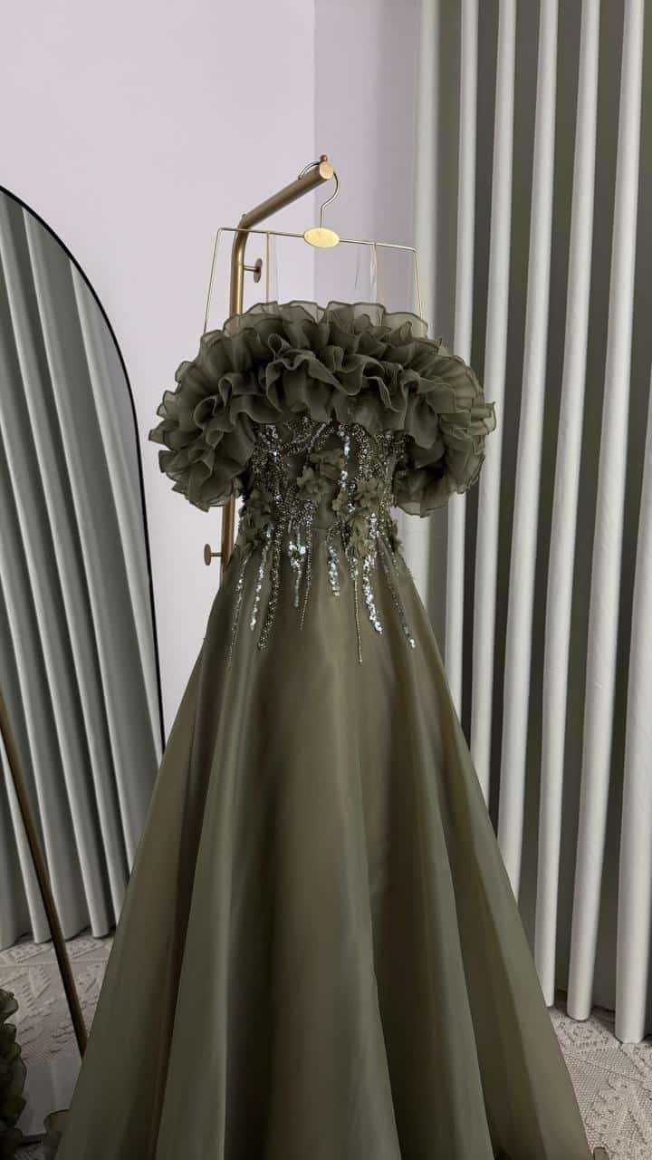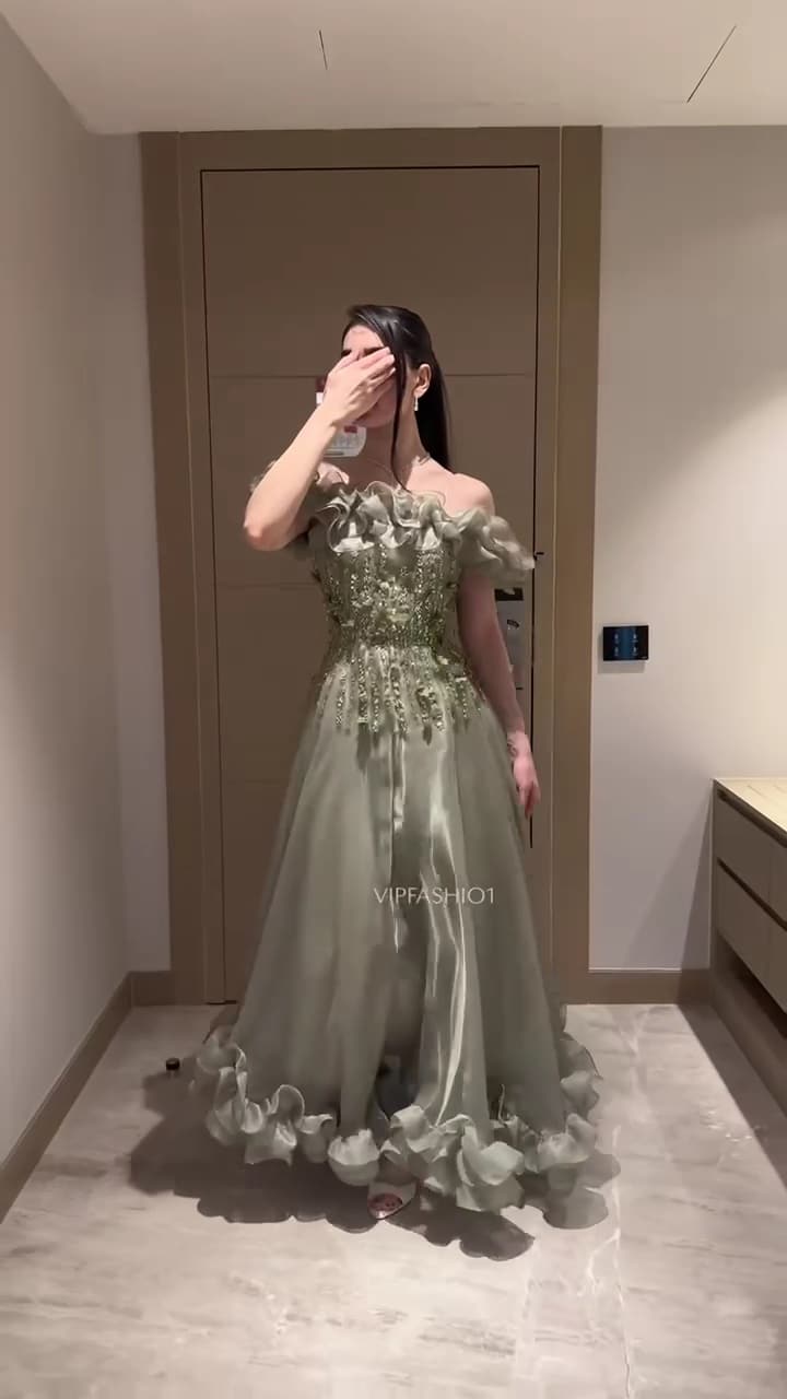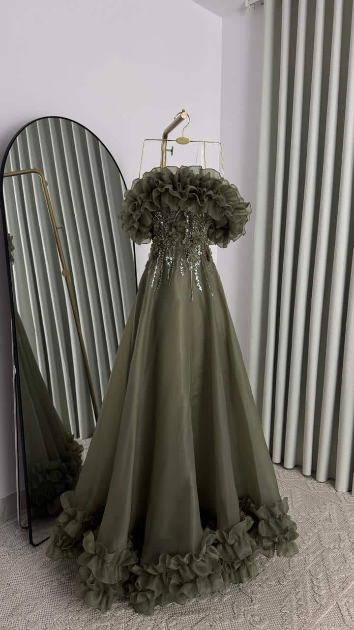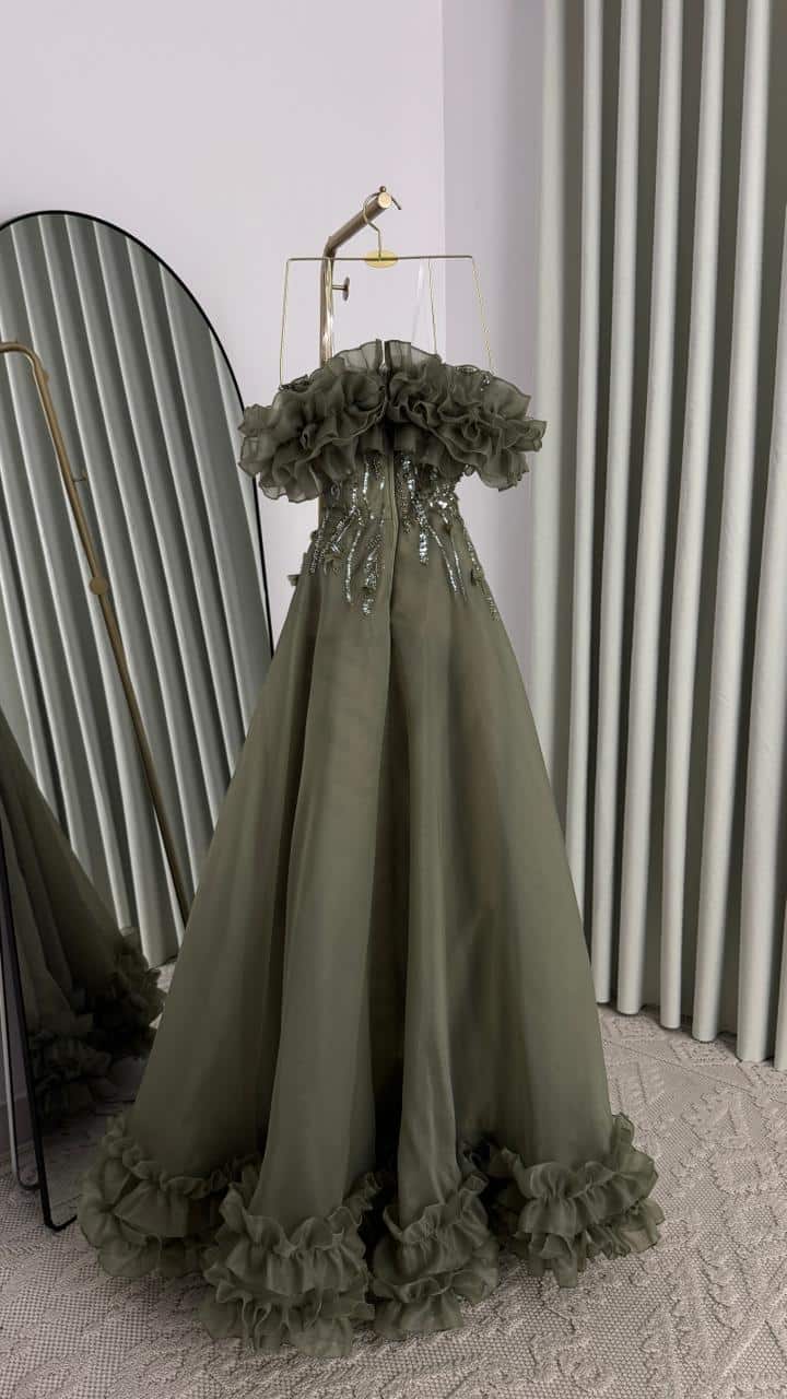 تألقي بإطلالة ناعمة وراقية مع هذا الفستان الأخضر السيج المصمم ليمنحك حضورًا أنثويًا مميزًا في السهرات والمناسبات الخاصة. يتميز الفستان بجزء علوي فاخر مزين بتطريزات لامعة تضيف بريقًا هادئًا تحت الإضاءة، مع قصة أوف شولدر أنيقة تبرز جمال الأكتاف بأسلوب رومانسي راقٍ.