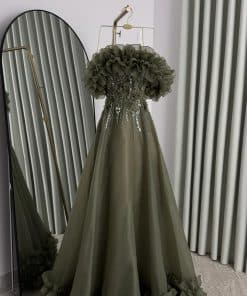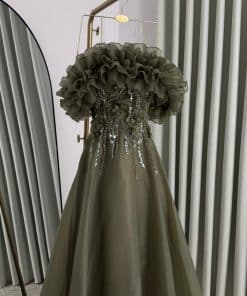 فستان سهرة أخضر سيج فاخر بتطريز لامع وكشكشة ناعمة
