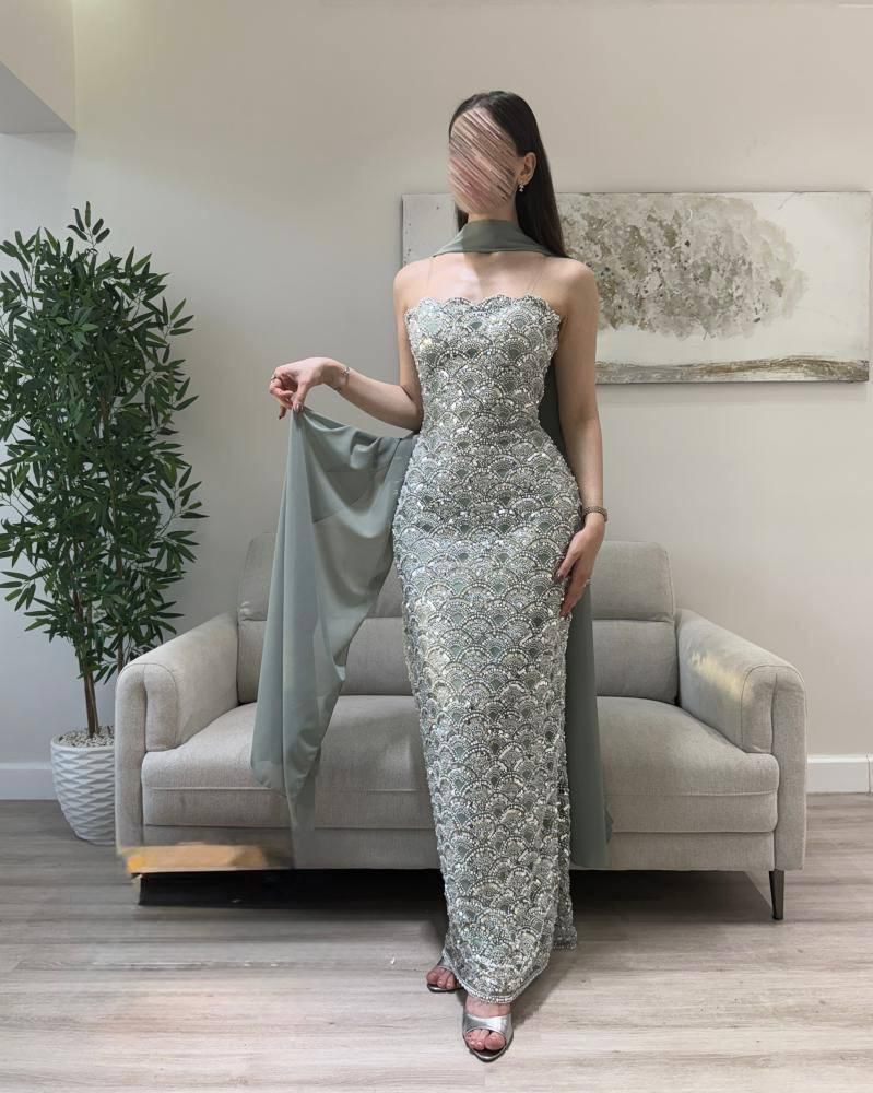 فستان سهرة أخضر ضيقة مع شال أنيق