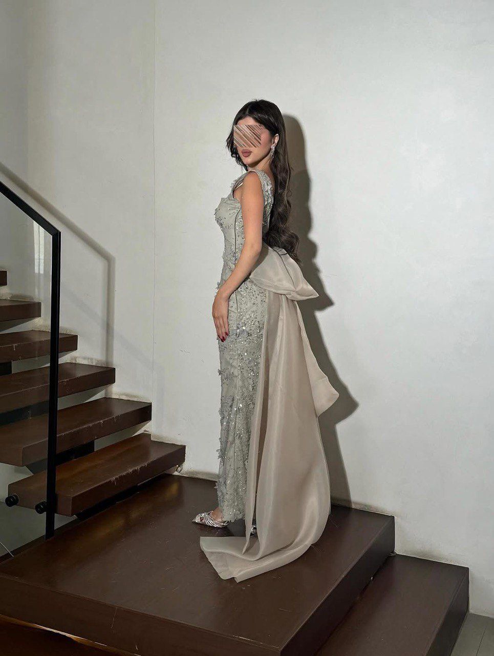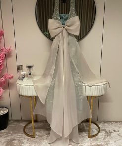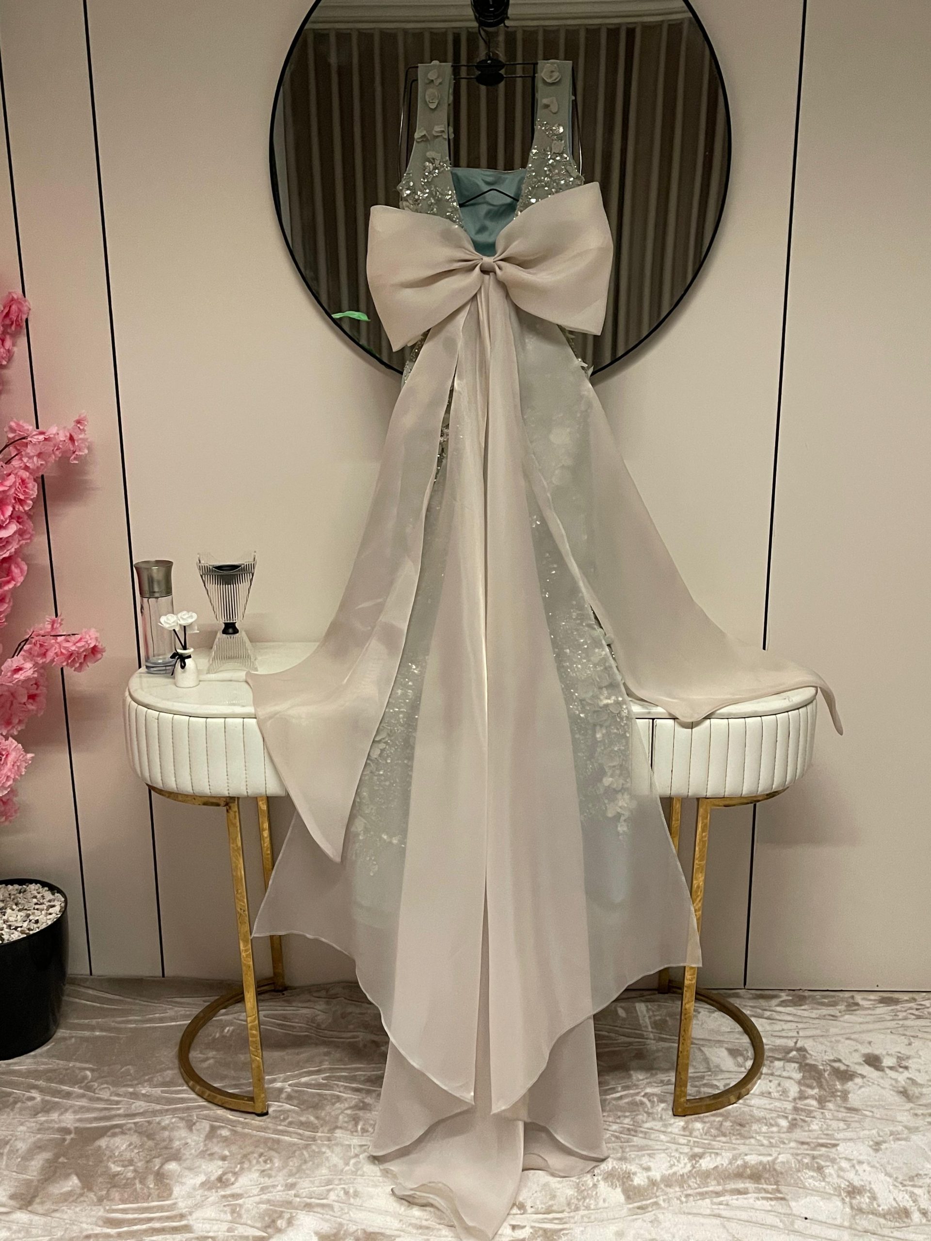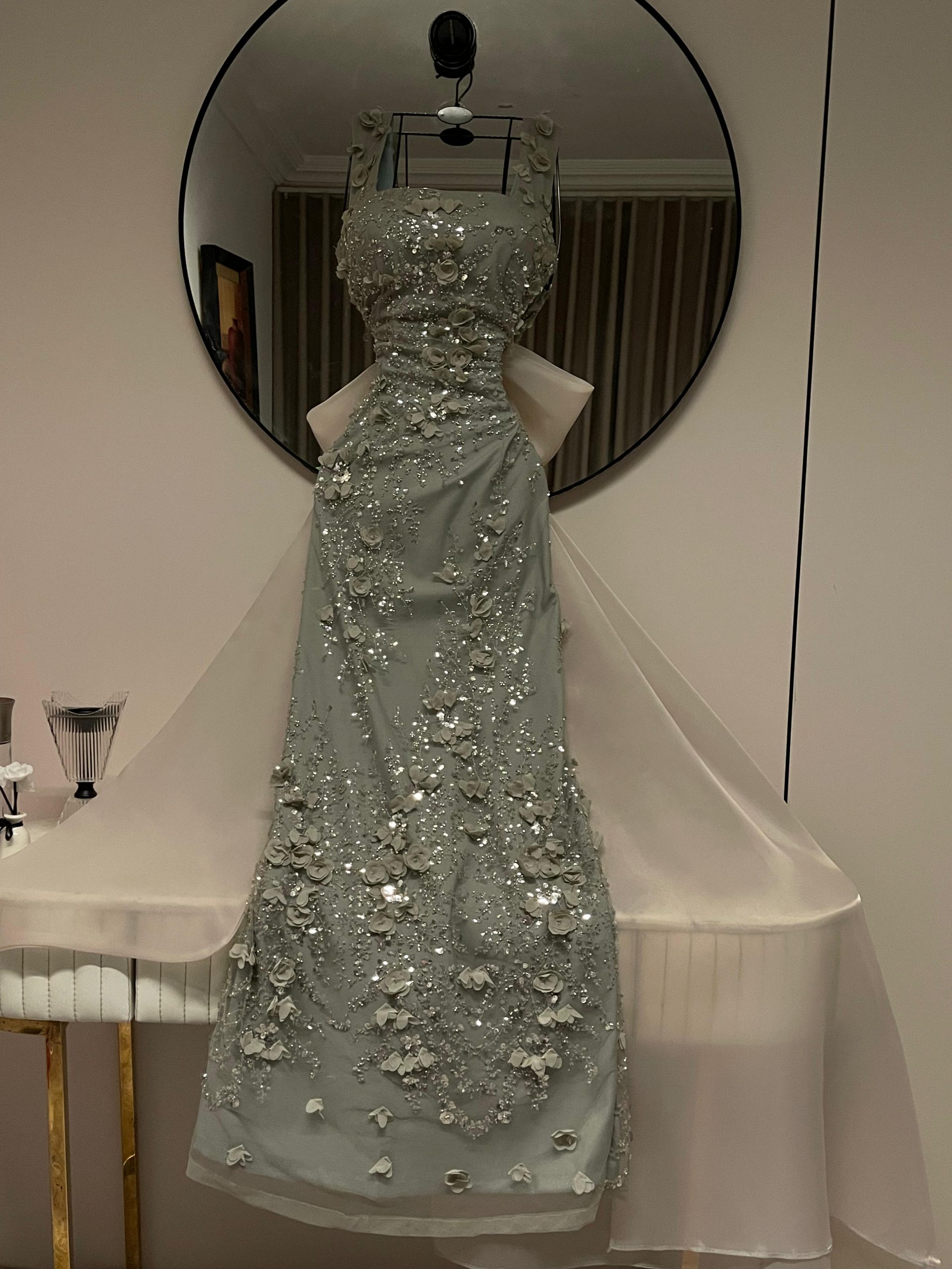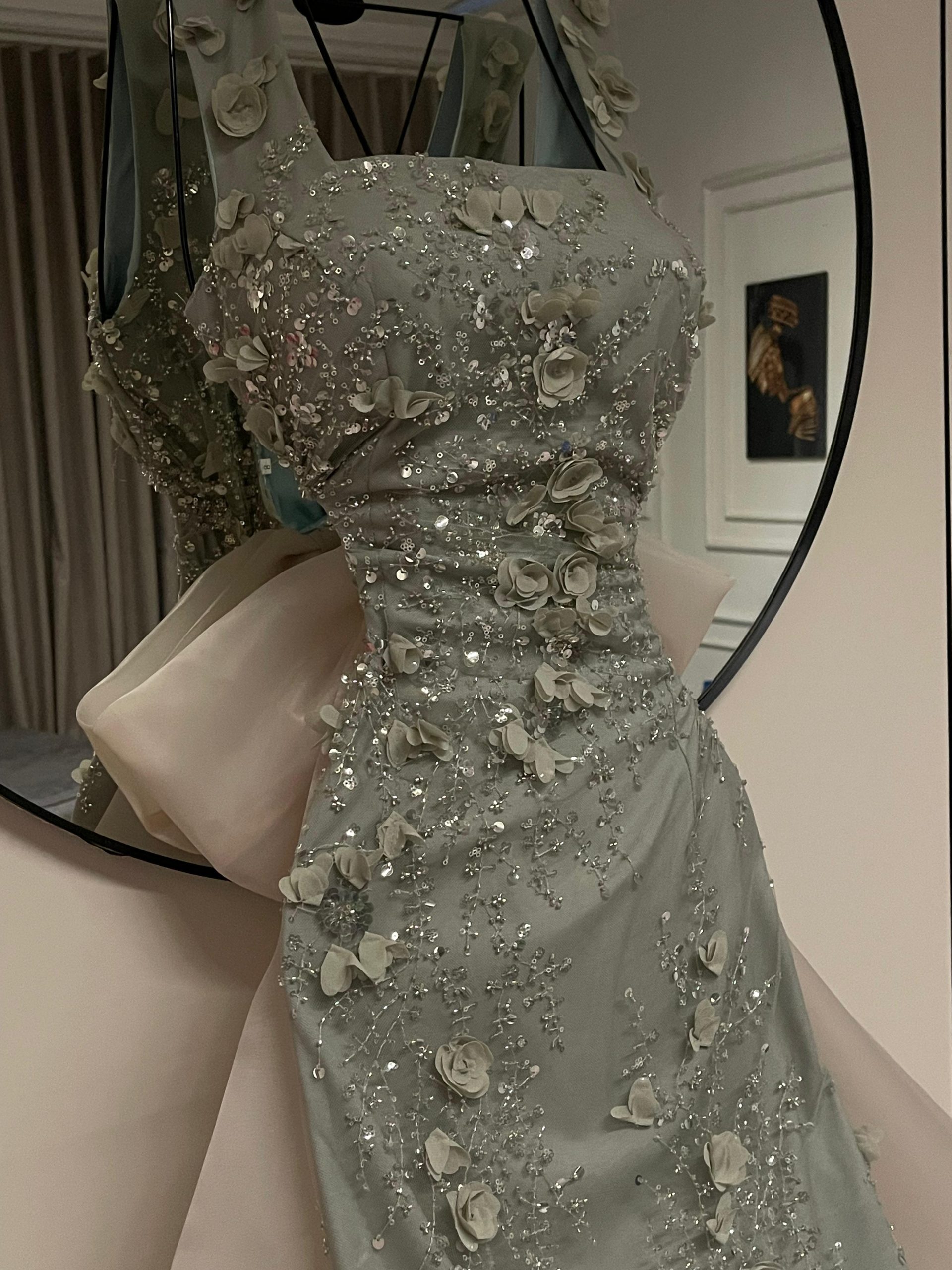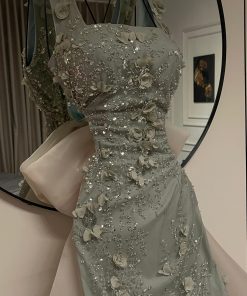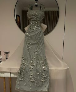 فستان سهرة أخضر فاخر بتطريز ثلاثي الأبعاد وذيل شيفون – متجر روزيتا السعودية
