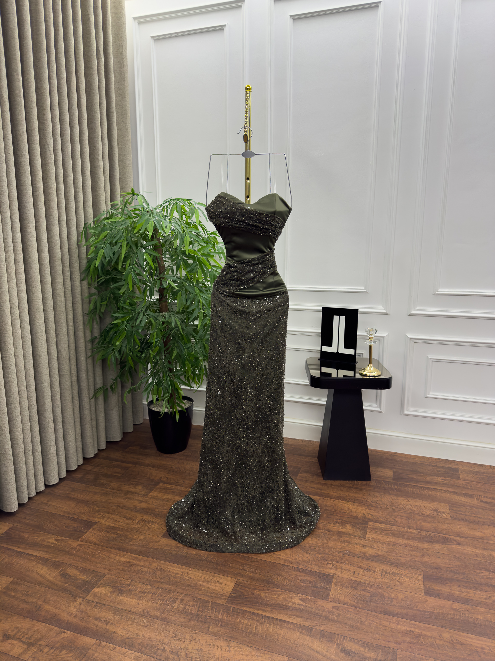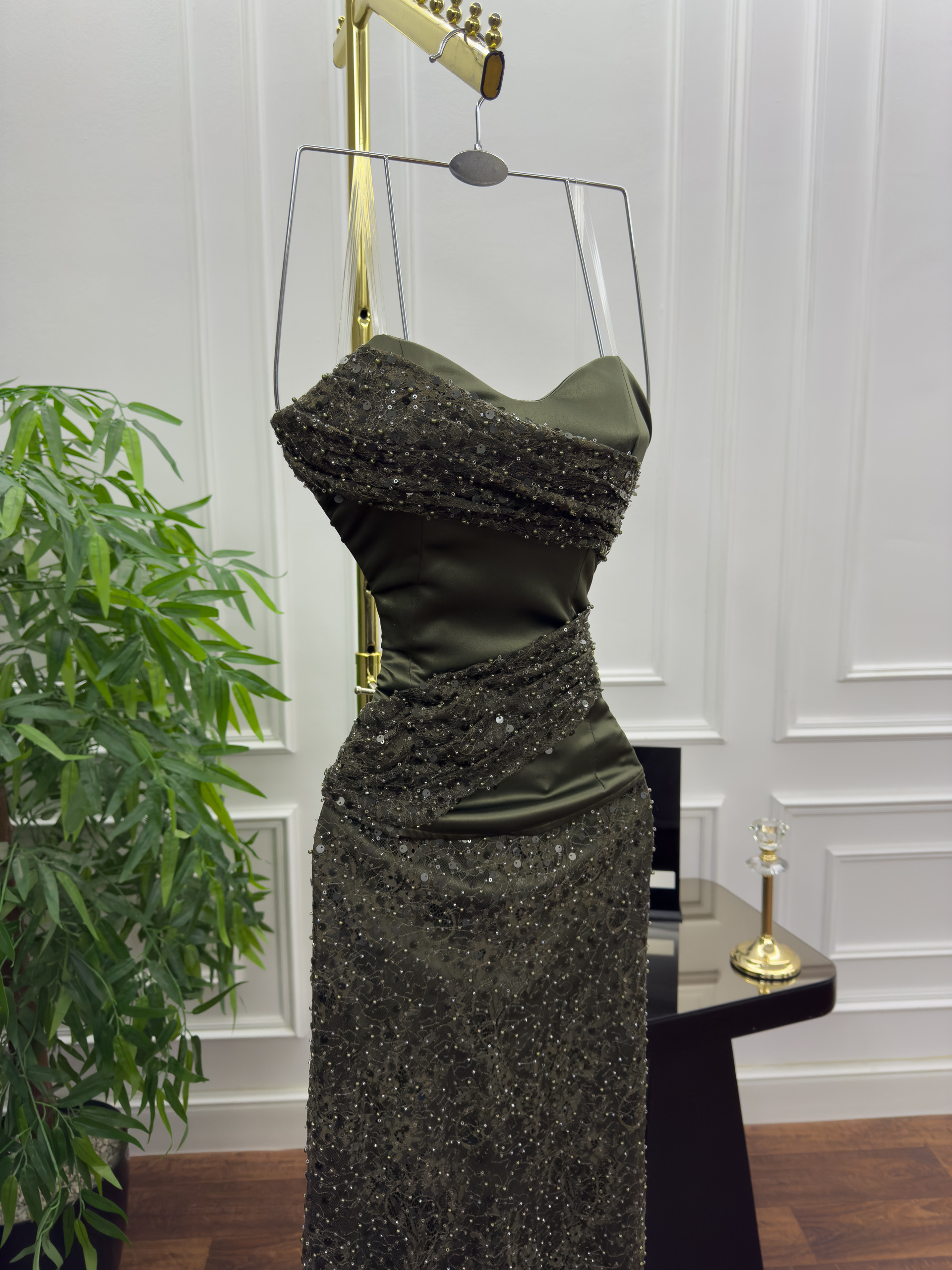 يأتي الفستان بلون أخضر لامع رائع مع تفاصيل زخرفية فاخرة من الترتر على طول الخصر وحواف الفستان، مما يضيف لمسة من البريق واللمعان عند الحركة. هذا الفستان الذي يتميز بالقصة المستقيمة ينساب على الجسم بشكل مريح، ويبرز جمالك بطريقة راقية، مما يجعله مثالياً للمناسبات الفاخرة.