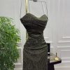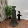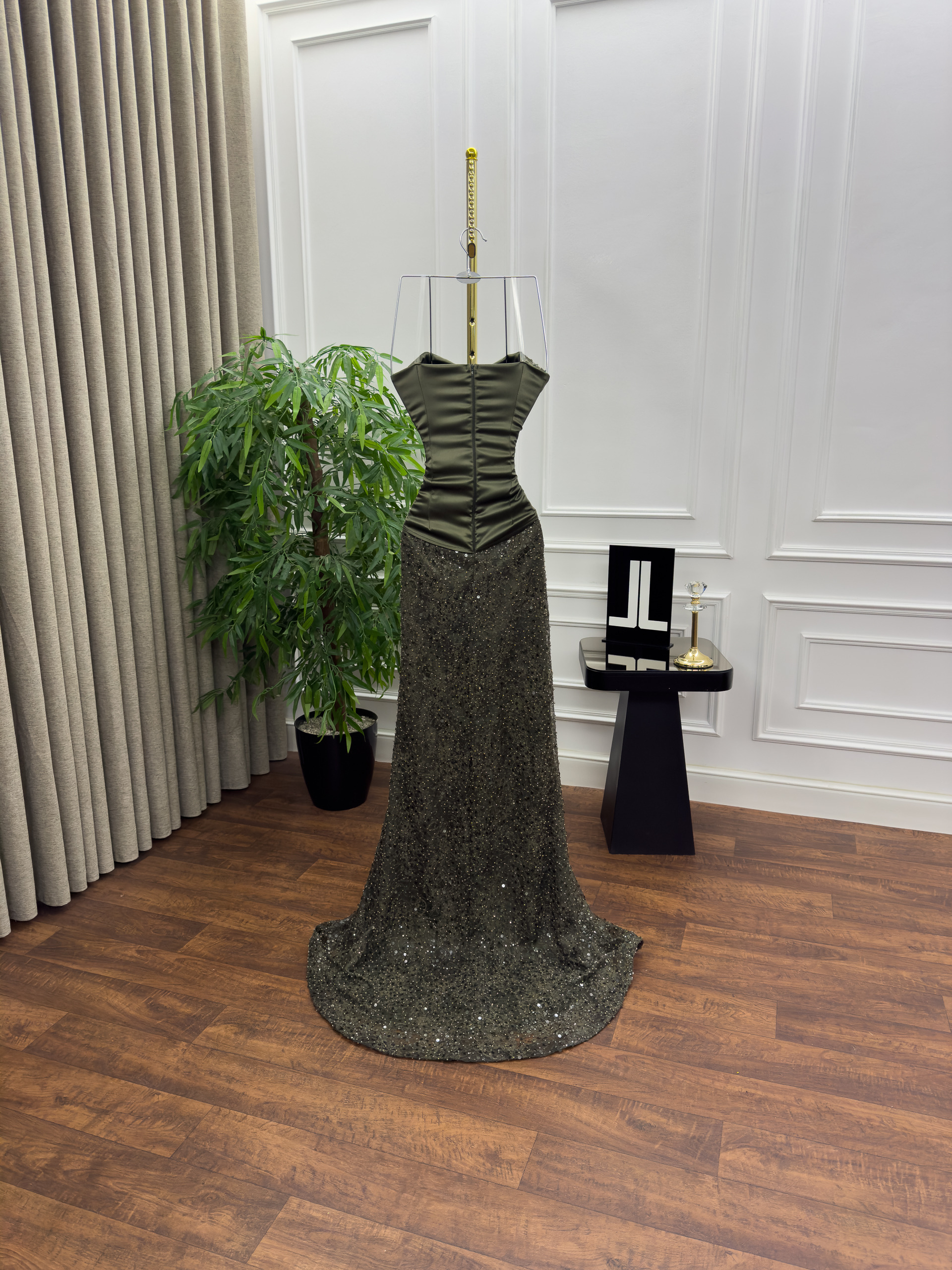 فستان سهرة أخضر لامع مزخرف بالتفاصيل اللامعة