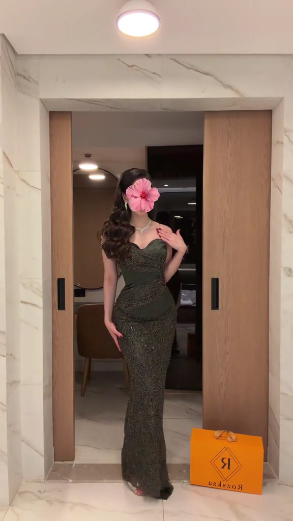 فستان سهرة أخضر لامع مزخرف – متجر روزيتا السعودية