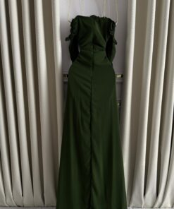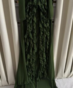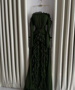يقدّم متجر روزيتا هذا الفستان الأخضر الداكن بتصميم فخم يجمع بين الانسيابية والرقيّ. يتميز الفستان بأكمام طويلة وقماش حريري ناعم يتدلّى بانسيابية راقية، مع طبقات من الكشاكش الطولية التي تضيف عمقًا وأناقة مذهلة للتصميم