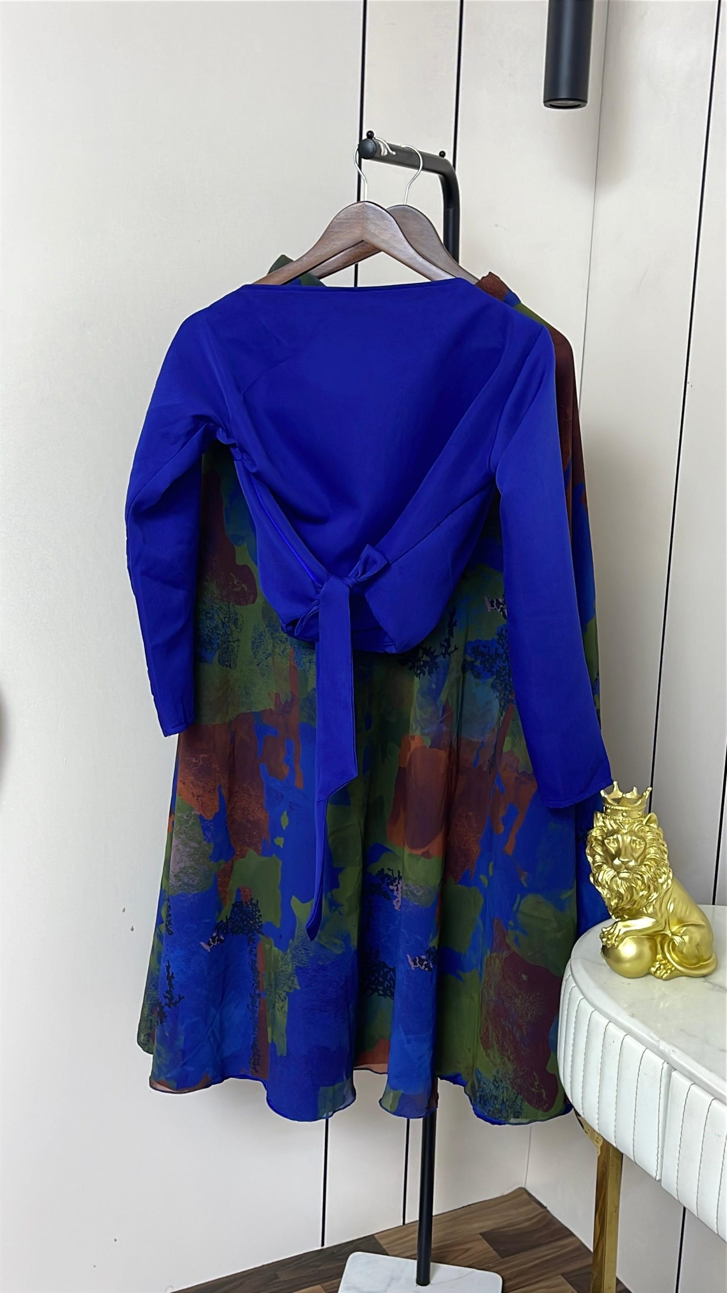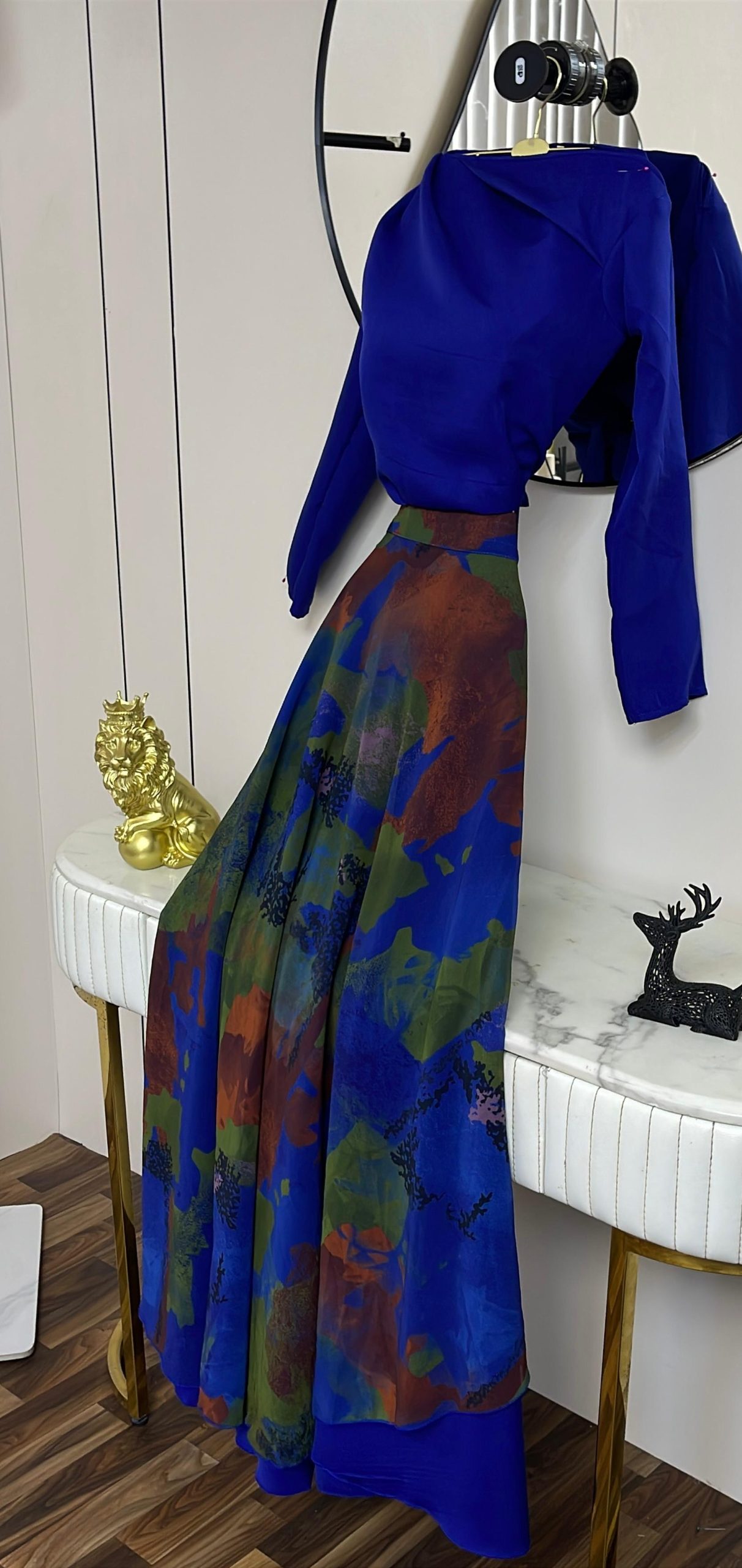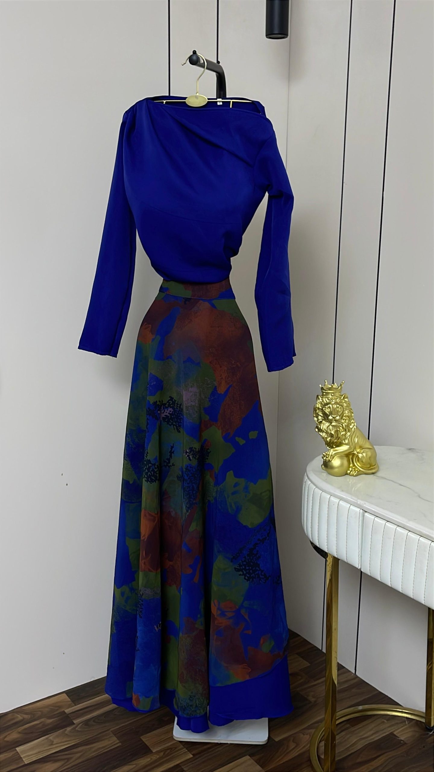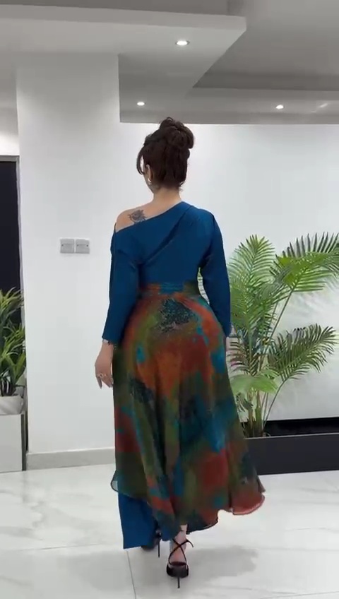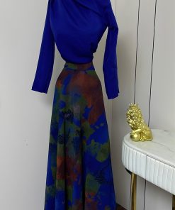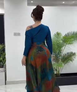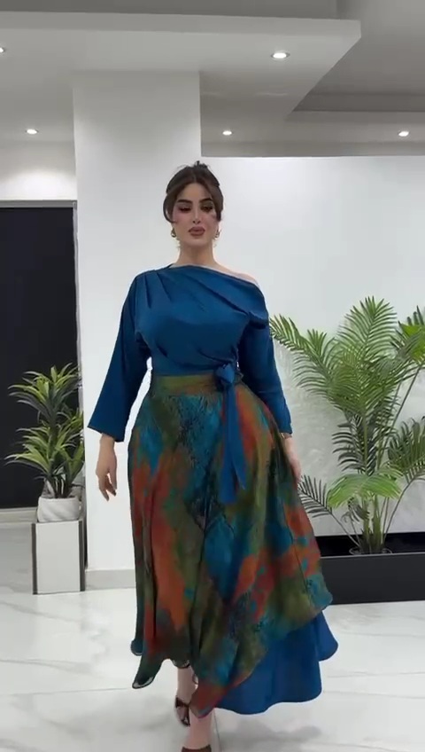 تأتي التنورة بتدرجات لونية فنية متعددة تضيف لمسة حيوية وحركة انسيابية جذابة، مما يجعل الفستان خيارًا مثاليًا للسهرات والمناسبات الخاصة. خامته خفيفة ومريحة، تمنحك حرية الحركة وإطلالة راقية تلفت الأنظار.