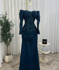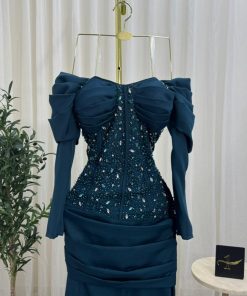 فستان سهرة أزرق بترولي مطرز بتصميم أوف شولدر وأكمام فاخرة