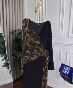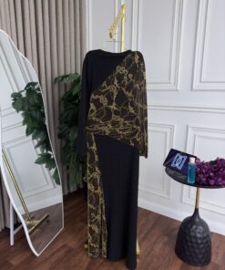 فستان نسائي فاخر باللون الأسود بأكمام طويلة وتصميم ملفوف، مزين بتطريزات ذهبية كاملة من الفخامة والرقي. وتتميز بقصة بارزة تبرز جمال القوام مع جانب جانبي أنثوي حرية الحركة وحركة خاصة خاصة. خامة عالية الجودة وأنيقة للارتداء، مثالية للمناسبات والحفلات الراقية.