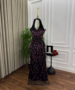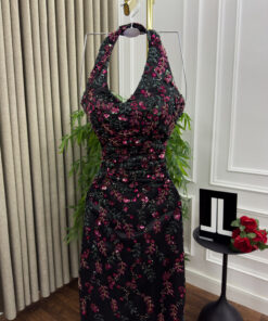 اكتشفي فستان سهرة أسود طويل بتصميم هالتر وتطريز وردي فاخر يمنحكِ إطلالة أنثوية ساحرة في المناسبات الخاصة والسهرات. تصميم أنيق يجمع بين الفخامة والرقي