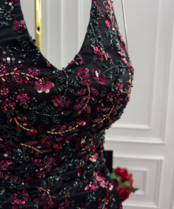 فستان سهرة أسود بتطريز وردي أنيق لإطلالة مسائية ساحرة”