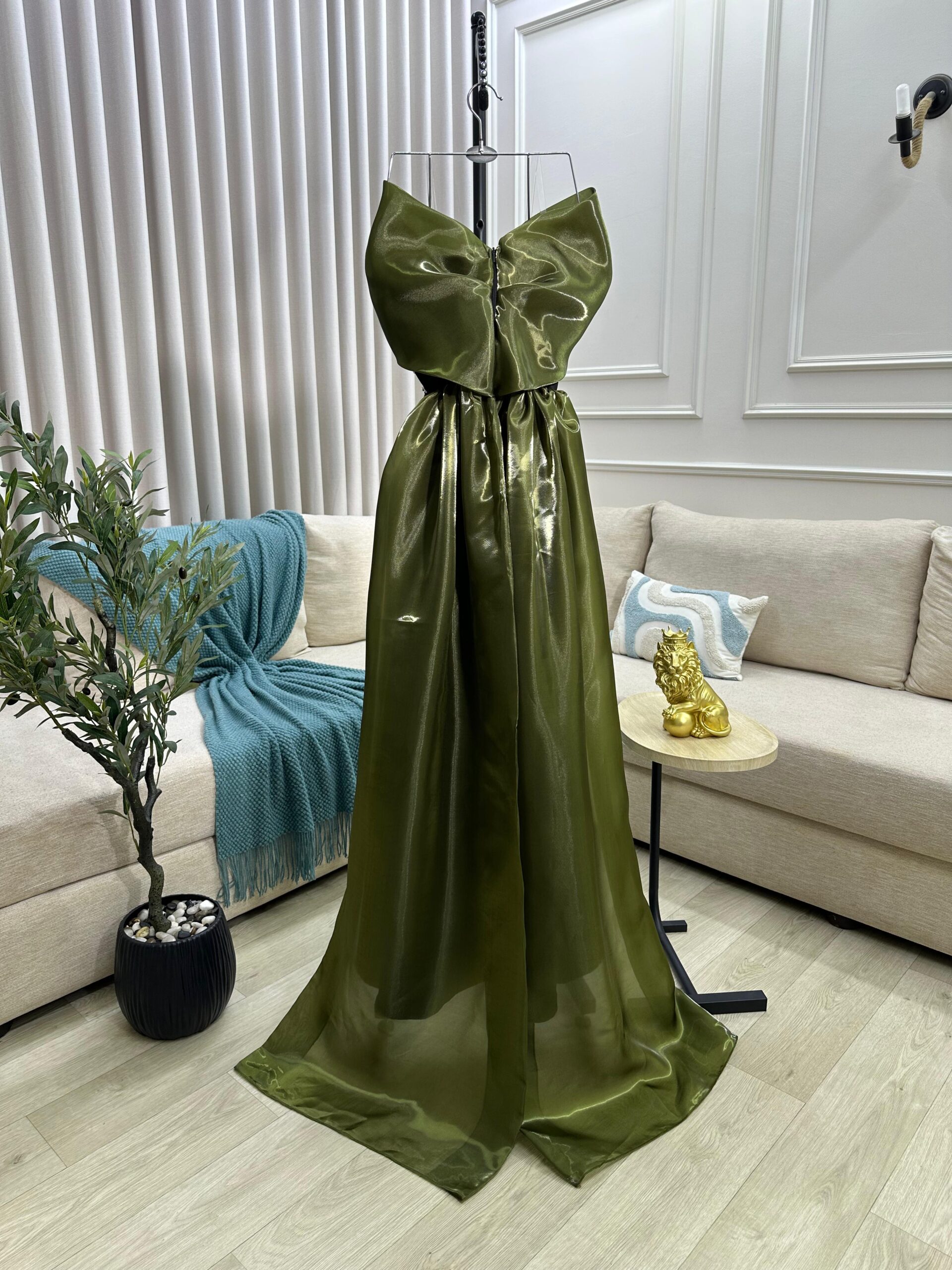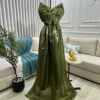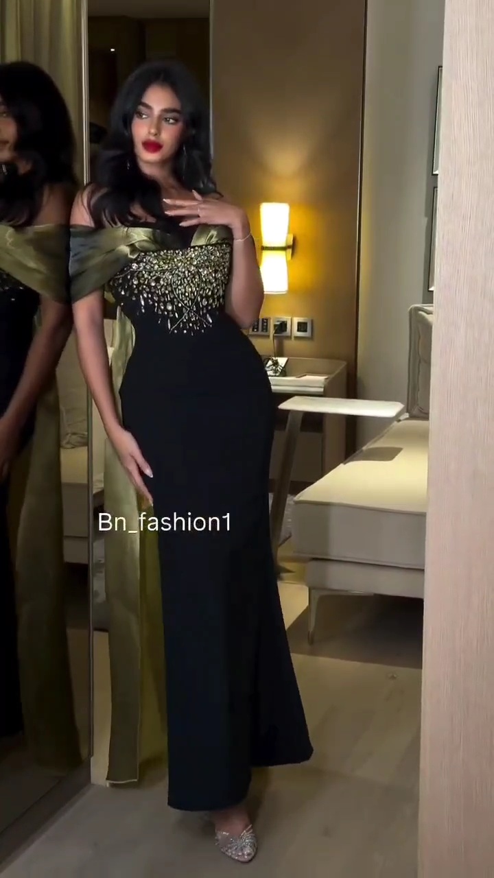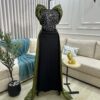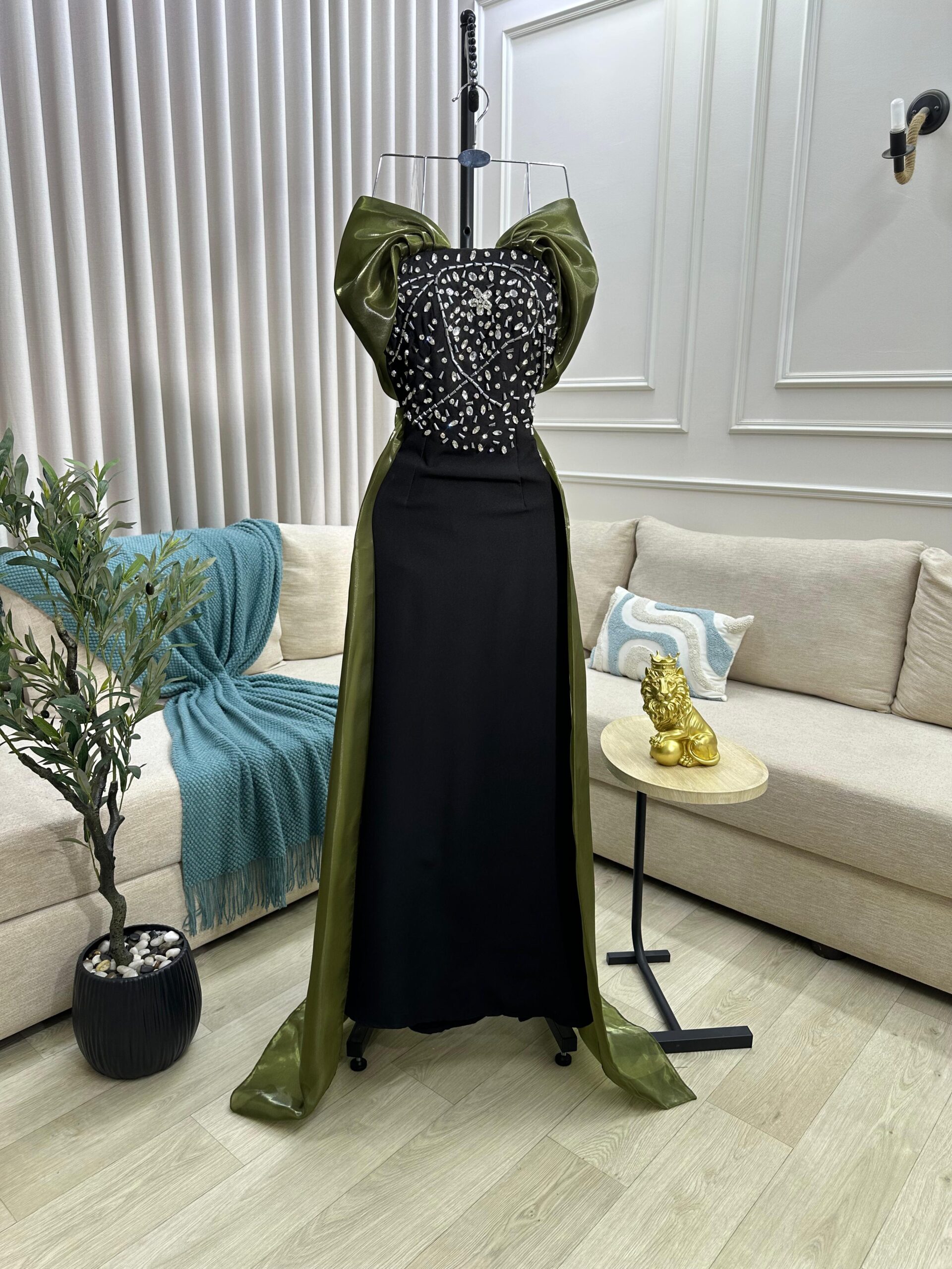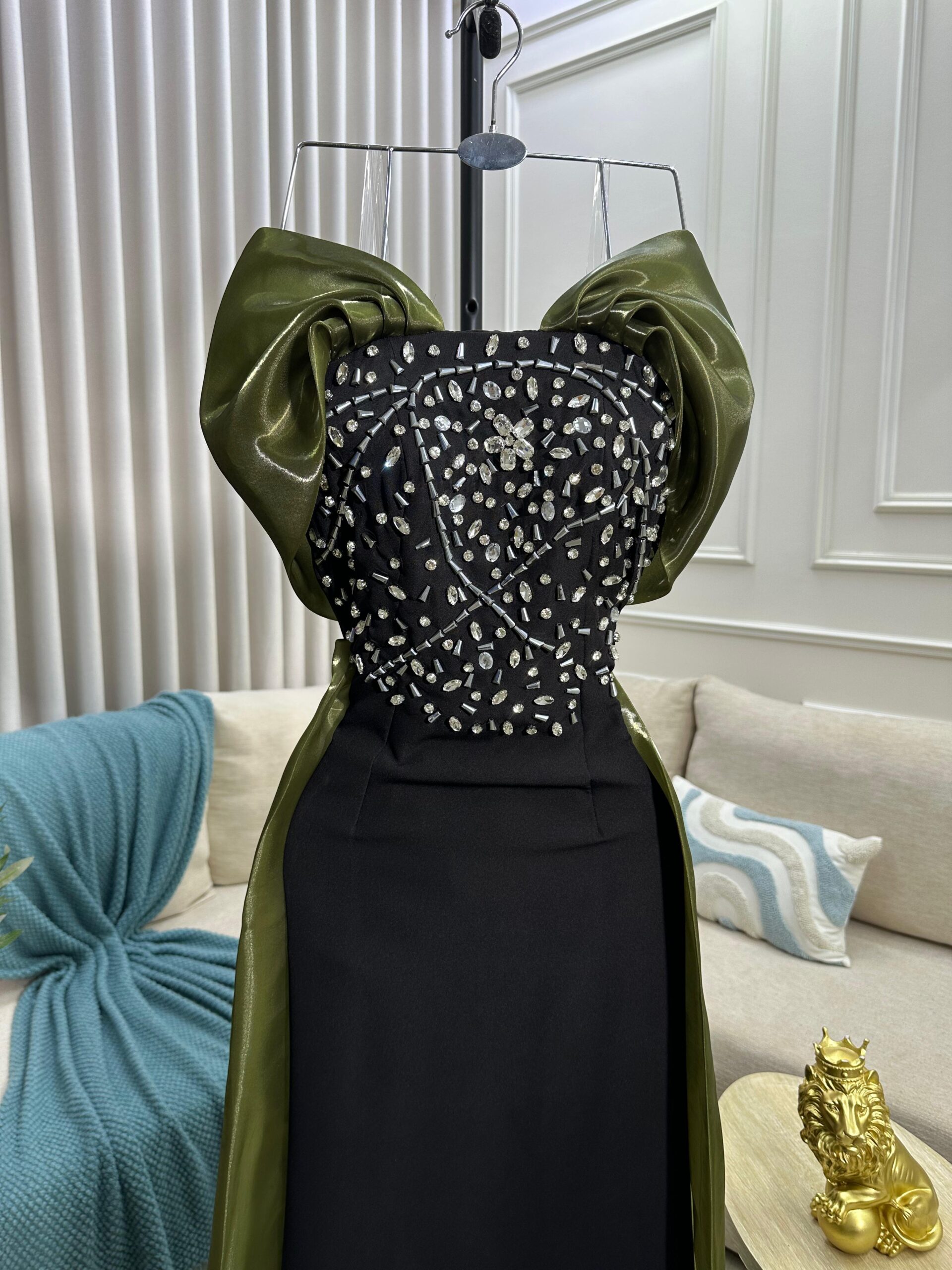 يجمع الفستان بين الأسود الكلاسيكي والأخضر الزيتي الحريري في مزيج نادر يلفت الأنظار دون مبالغة. الجزء العلوي يأتي مُرصّعًا بتوزيعات براقة تحاكي قطرات الضوء، بينما يظهر القماش الزيتي بطريقة ساحرة على الكتفين، مصممًا على شكل عقدة فاخرة تمنح إطلالتك طابعًا ملكيًا.