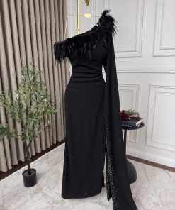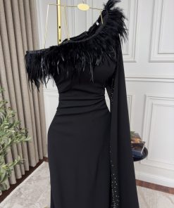 فستان سهرة أسود بقصة كتف واحد مزين بالريش مع شال أنيق – متجر روزيتا السعودية