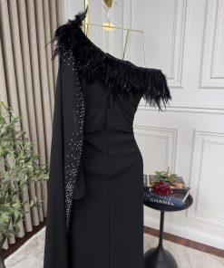 فستان سهرة أسود بقصة كتف واحد مع ريش فاخر من متجر روزيتا السعودية