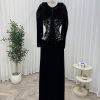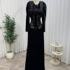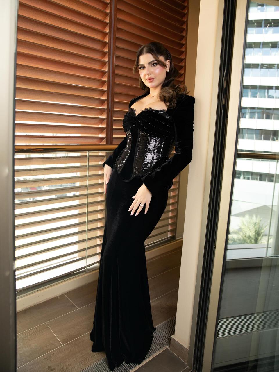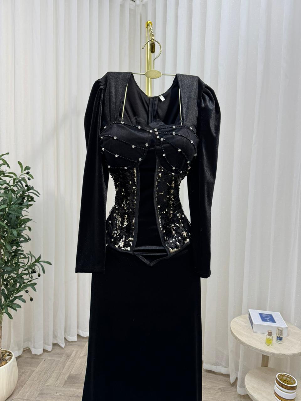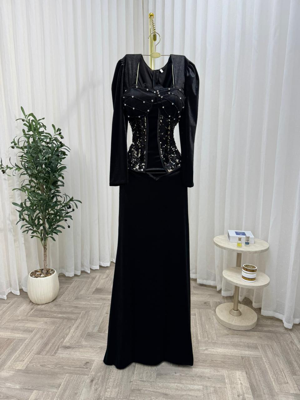 الجزء العلوي مطرز بالترتر اللامع بتفاصيل فاخرة تضيف لمسة من التألق دون مبالغة، مع أكمام طويلة تمنح الإطلالة توازنًا مثاليًا بين الجرأة والرقي. القماش الأسود الانسيابي في الجزء السفلي يضفي أناقة كلاسيكية ويجعل الفستان خيارًا مثاليًا للسهرات الراقية.