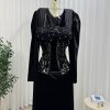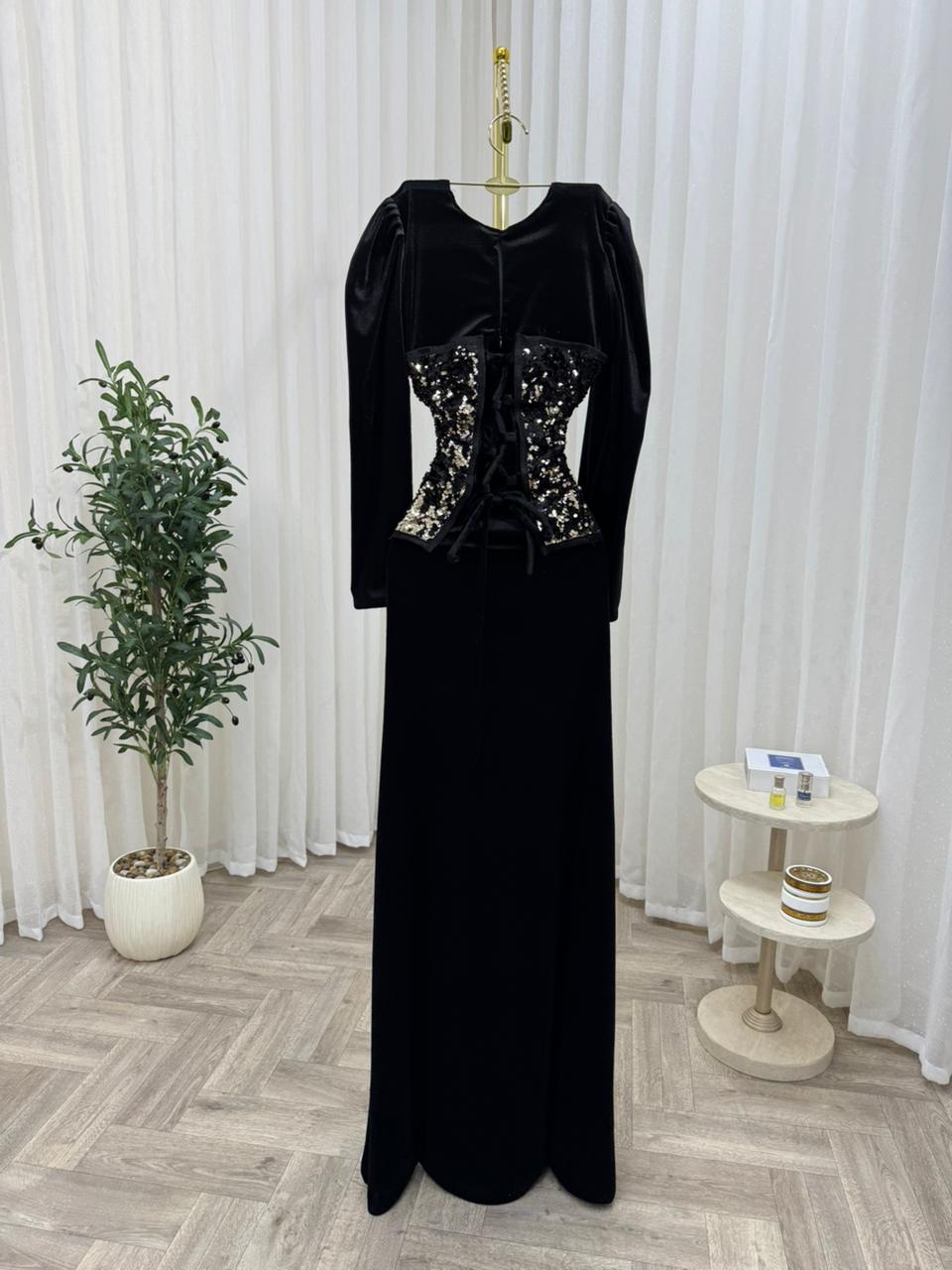 فستان سهرة أسود بقصة كورسيه مطرز بالترتر