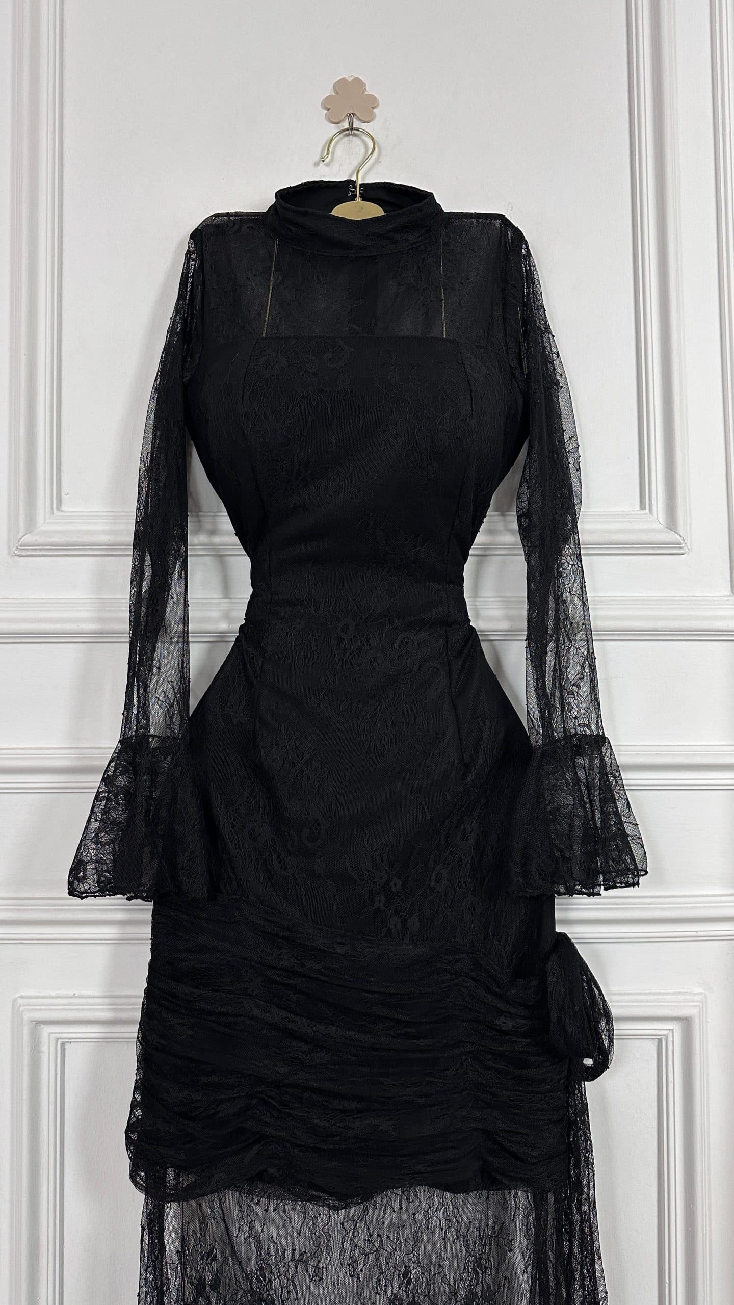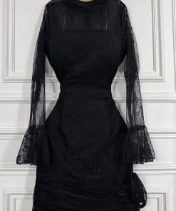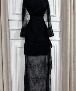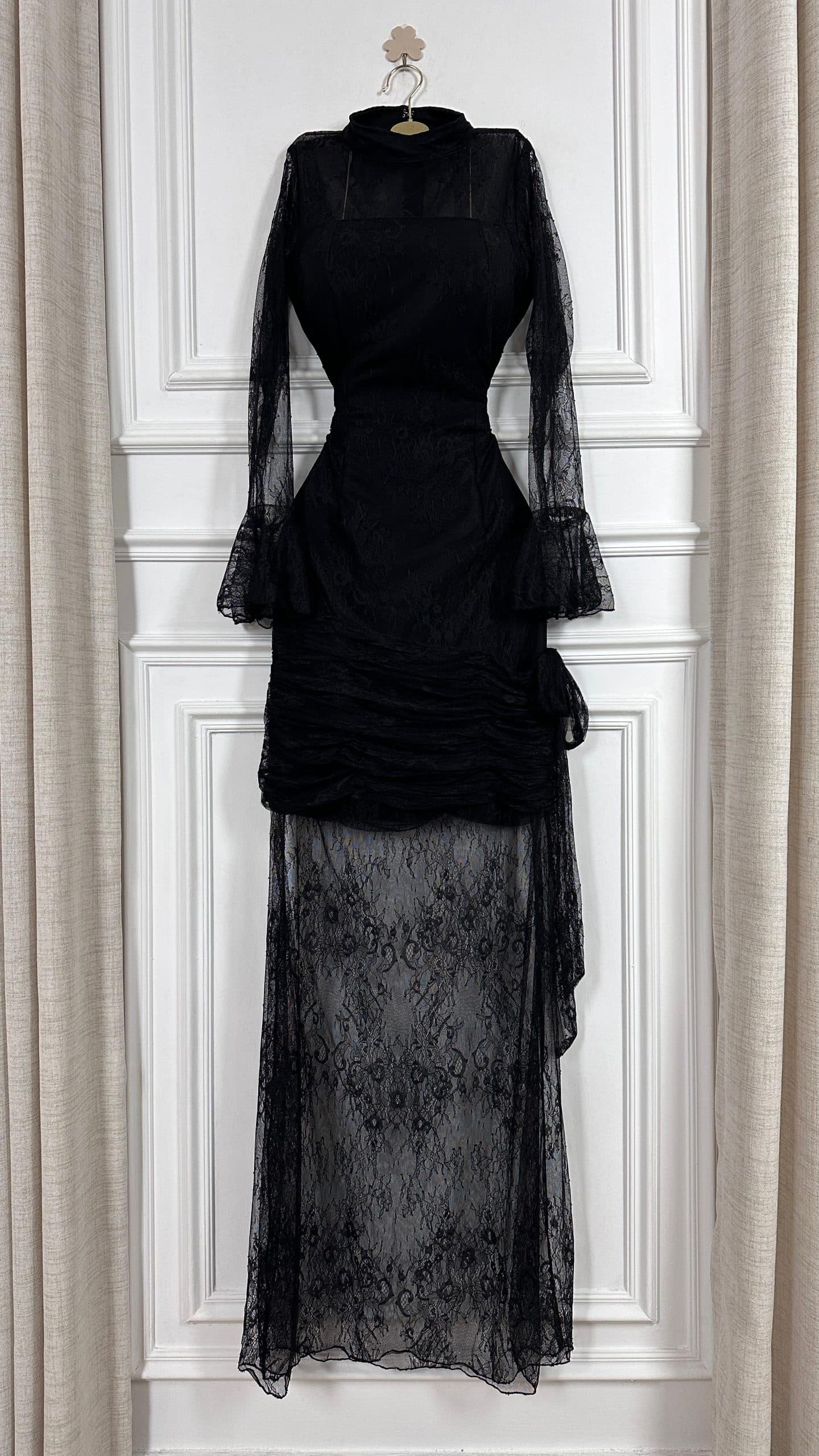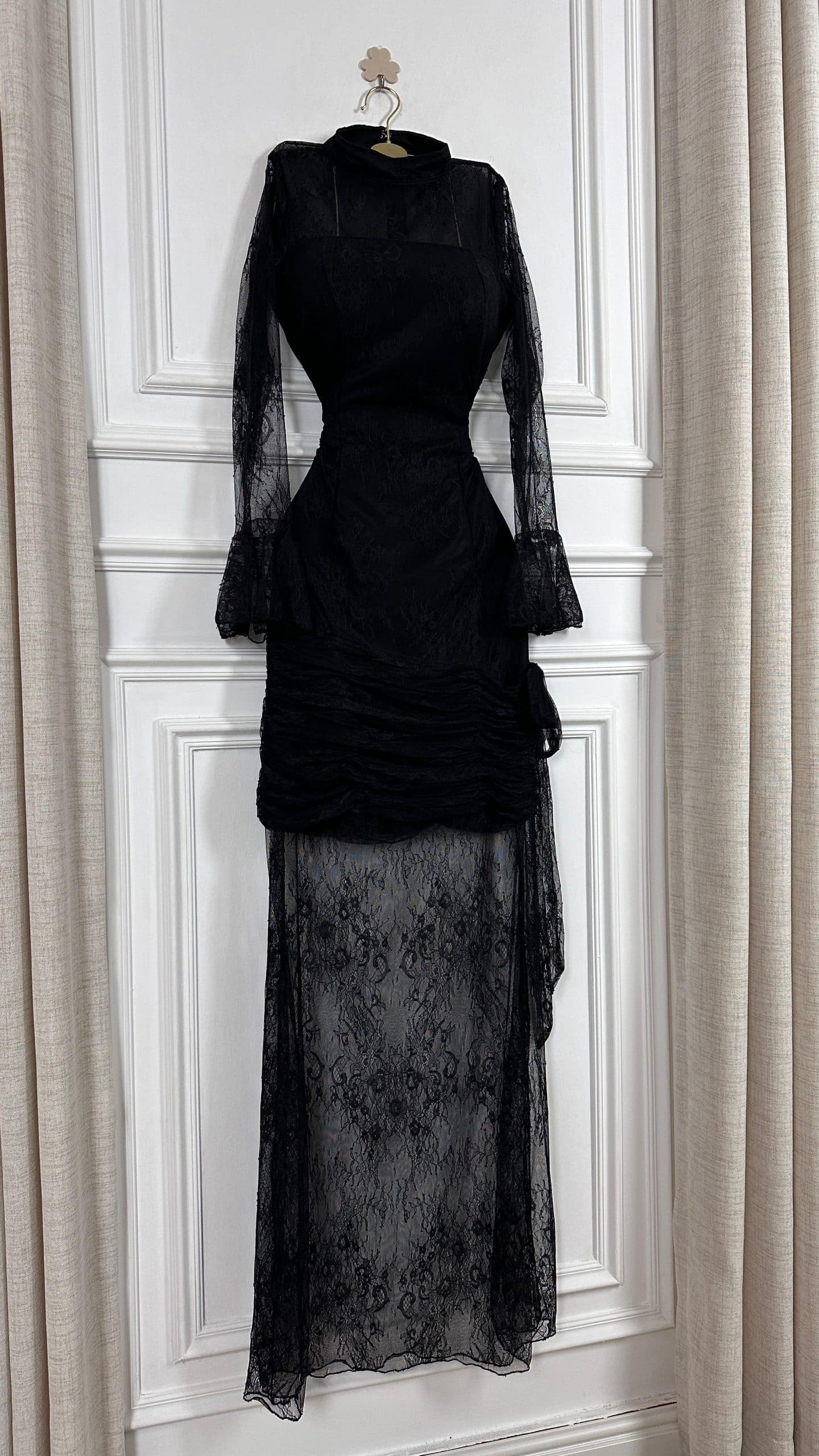 فستان سهرة أسود دانتيل شفاف بتصميم عصري جذاب