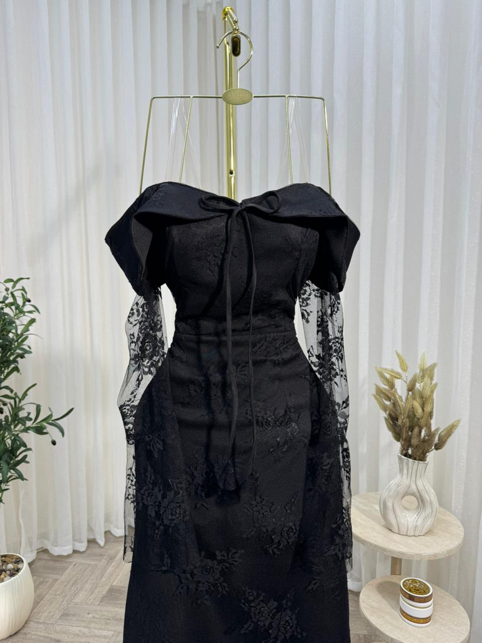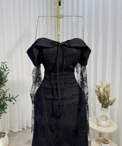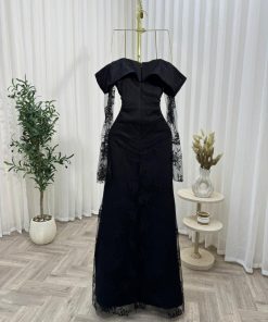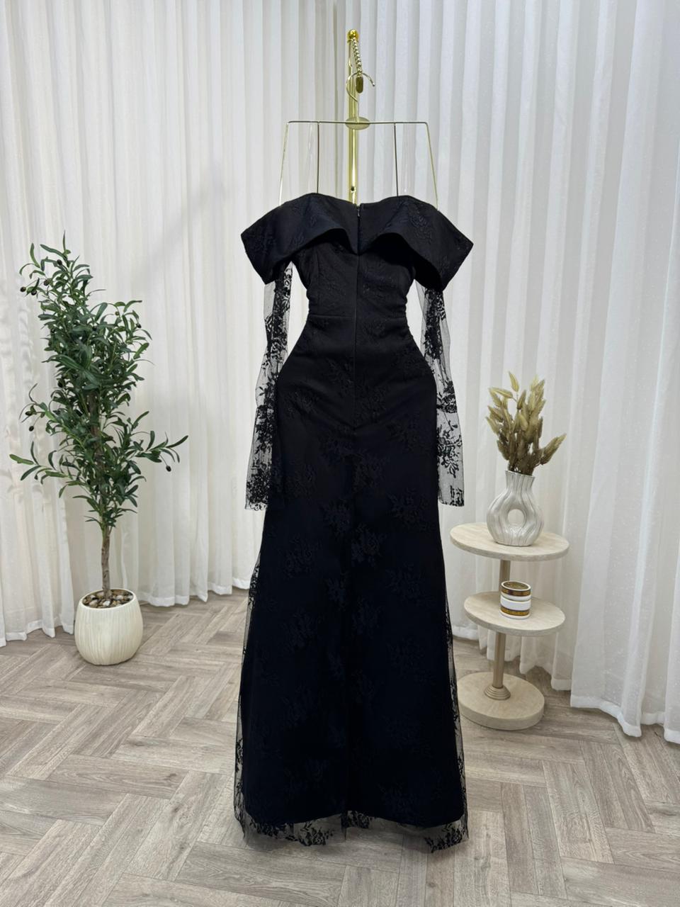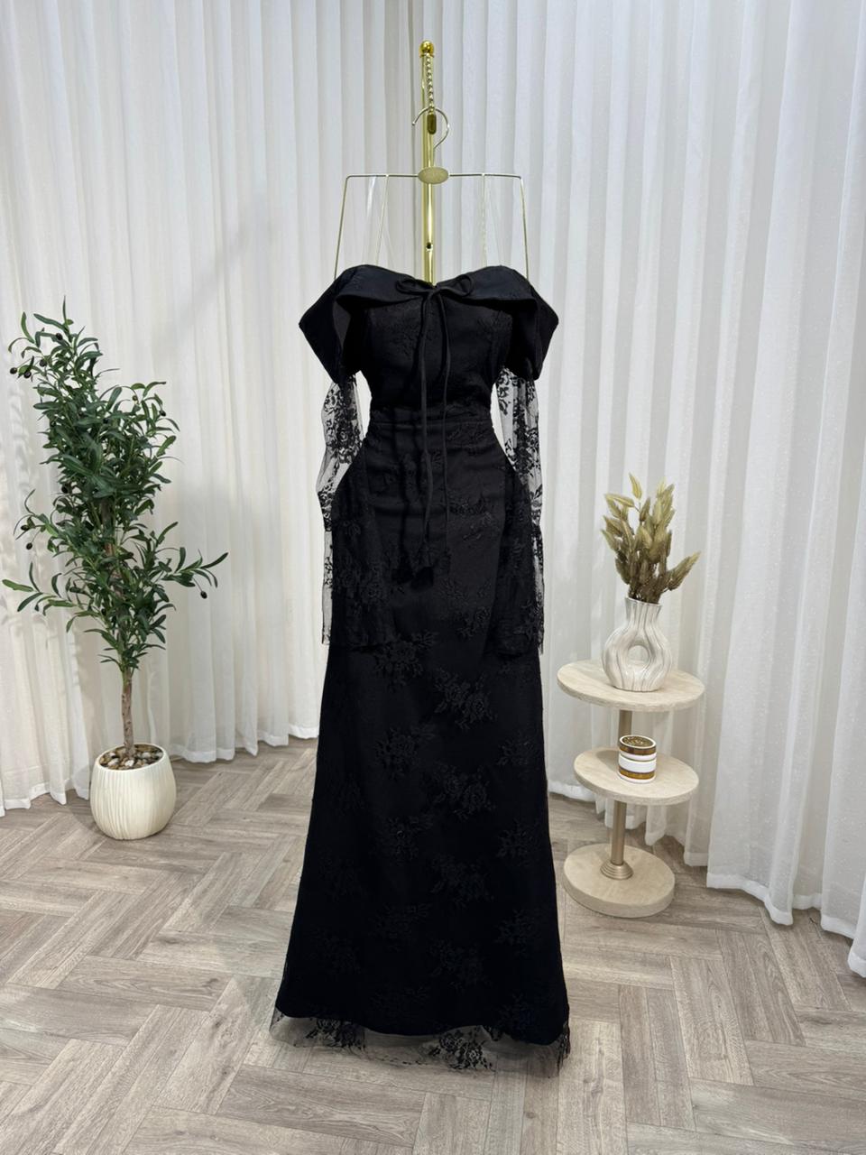 فستان سهرة أسود فاخر بأكمام دانتيل