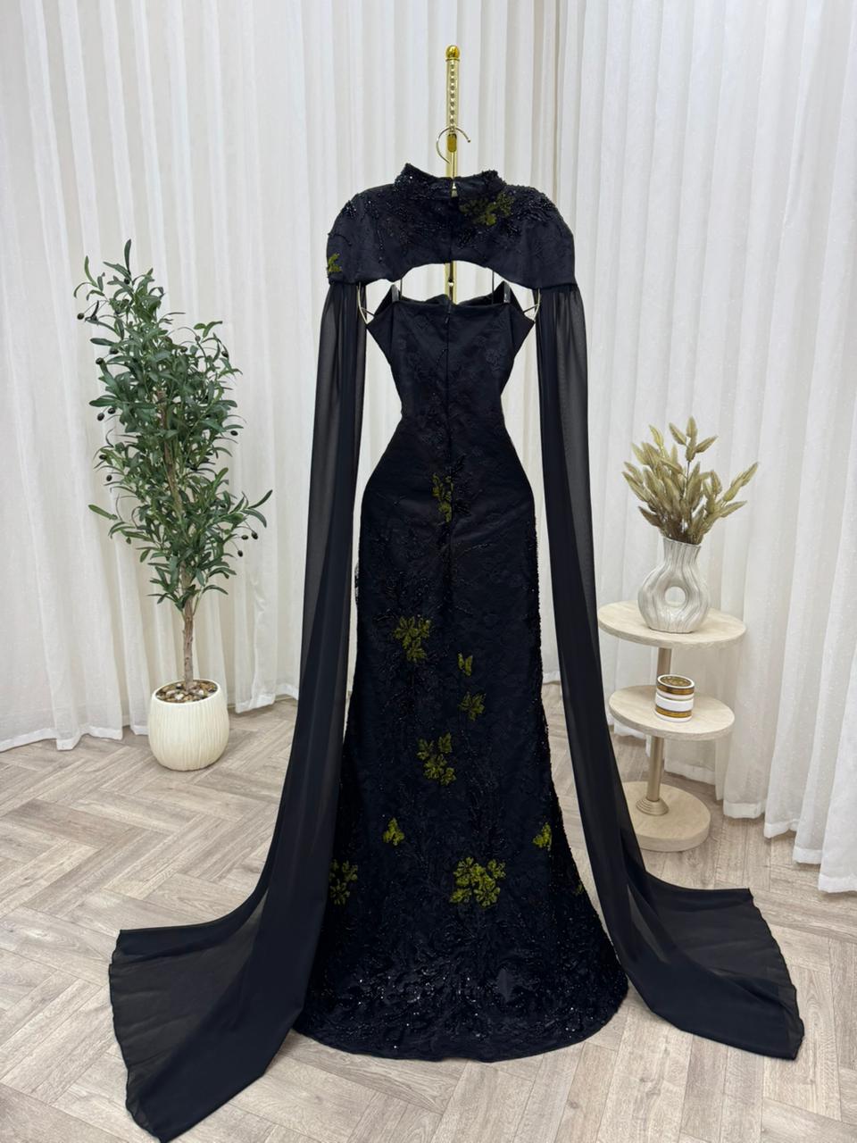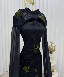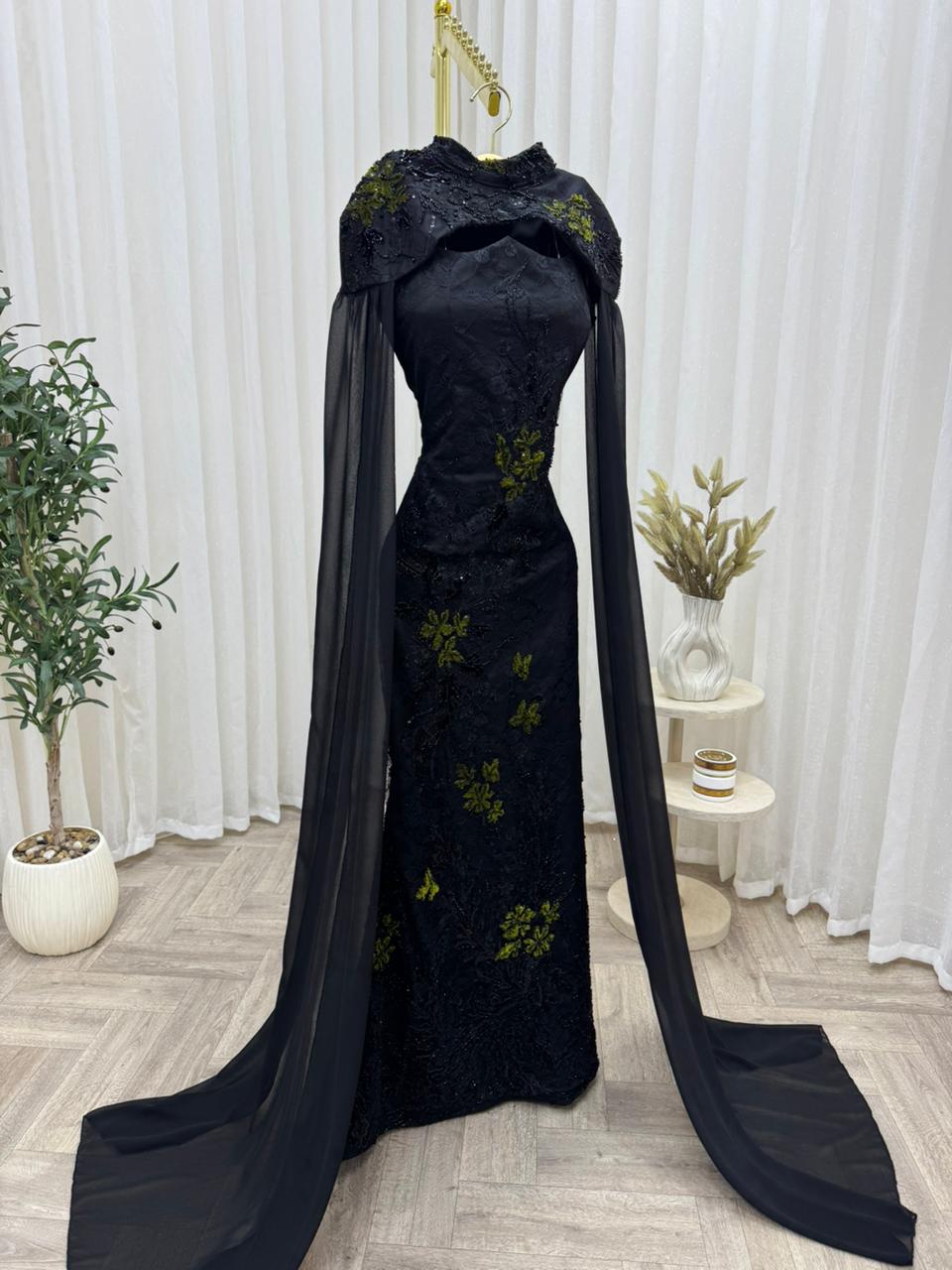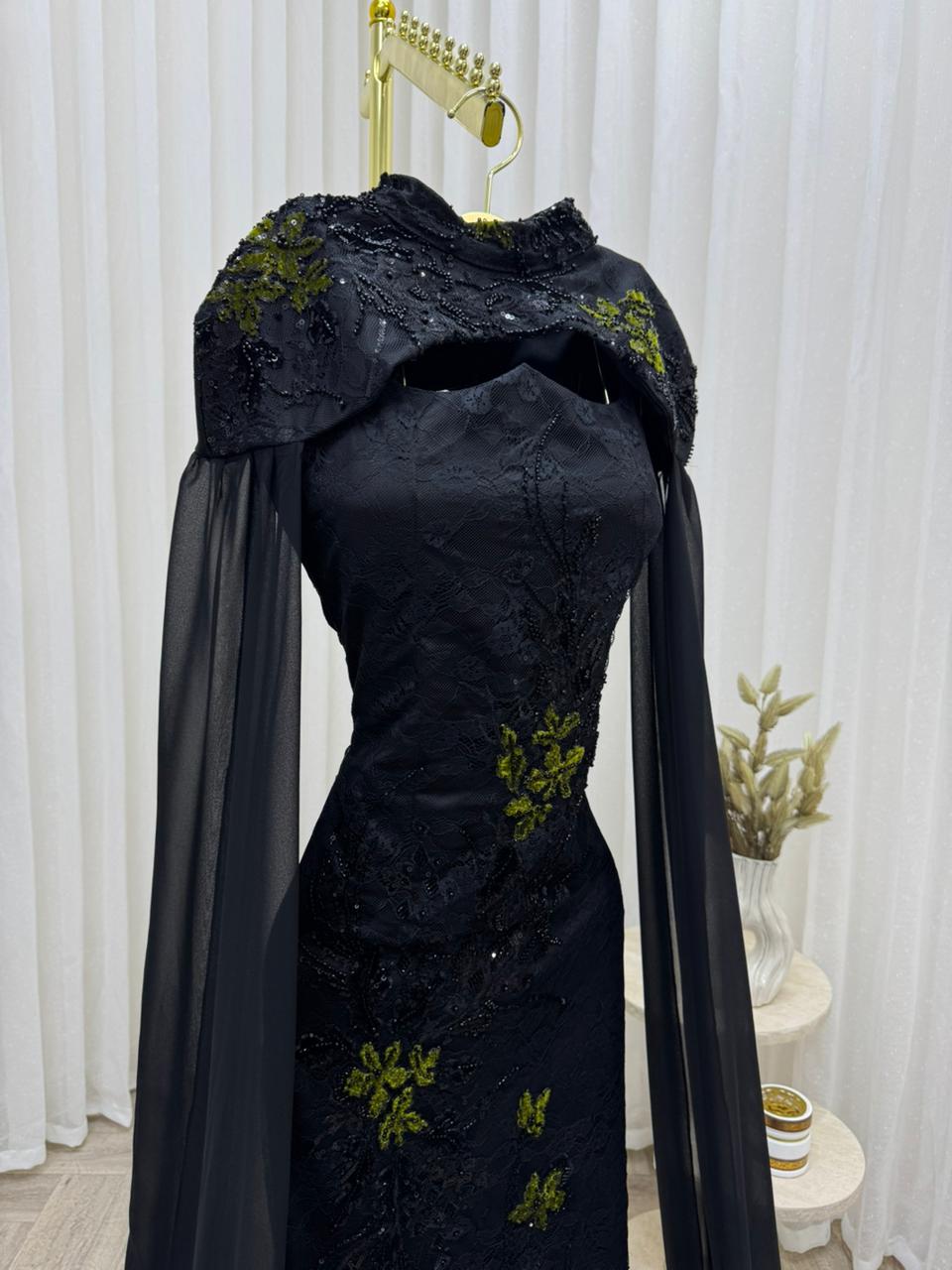 فستان سهرة أسود فاخر بتطريز أخضر وكاب شيفون طويل – متجر روزيتا السعودية
