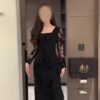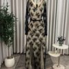 يتميز بقصّة ضيقة تُبرز جمال القوام، مع أكمام طويلة شفافة مطرزة تضيف لمسة من الرقي والأنوثة.
