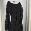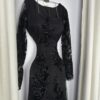 يأتي الفستان بلون أسود كلاسيكي أنيق، مزين بتطريز يدوي فاخر من الخرز اللامع والنقوش الوردية الراقية، مما يضفي عليه لمسة من السحر والجاذبية.
