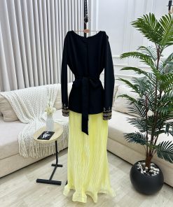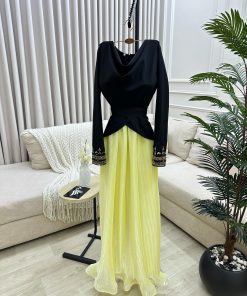 الفستان يأتي بتصميم فريد من نوعه بلونين متباينين، الأسود في الجزء العلوي والصفراء في التنورة، مما يخلق تأثيرًا بصريًا مذهلاً. الجزء العلوي مصنوع من قماش أسود أنيق مع تفاصيل مذهلة عند الأكمام، بينما تأتي التنورة بلون أصفر ناعم وقماش مميز يضفي على الفستان لمسة من الجمال الطبيعي والأناقة.