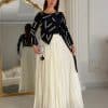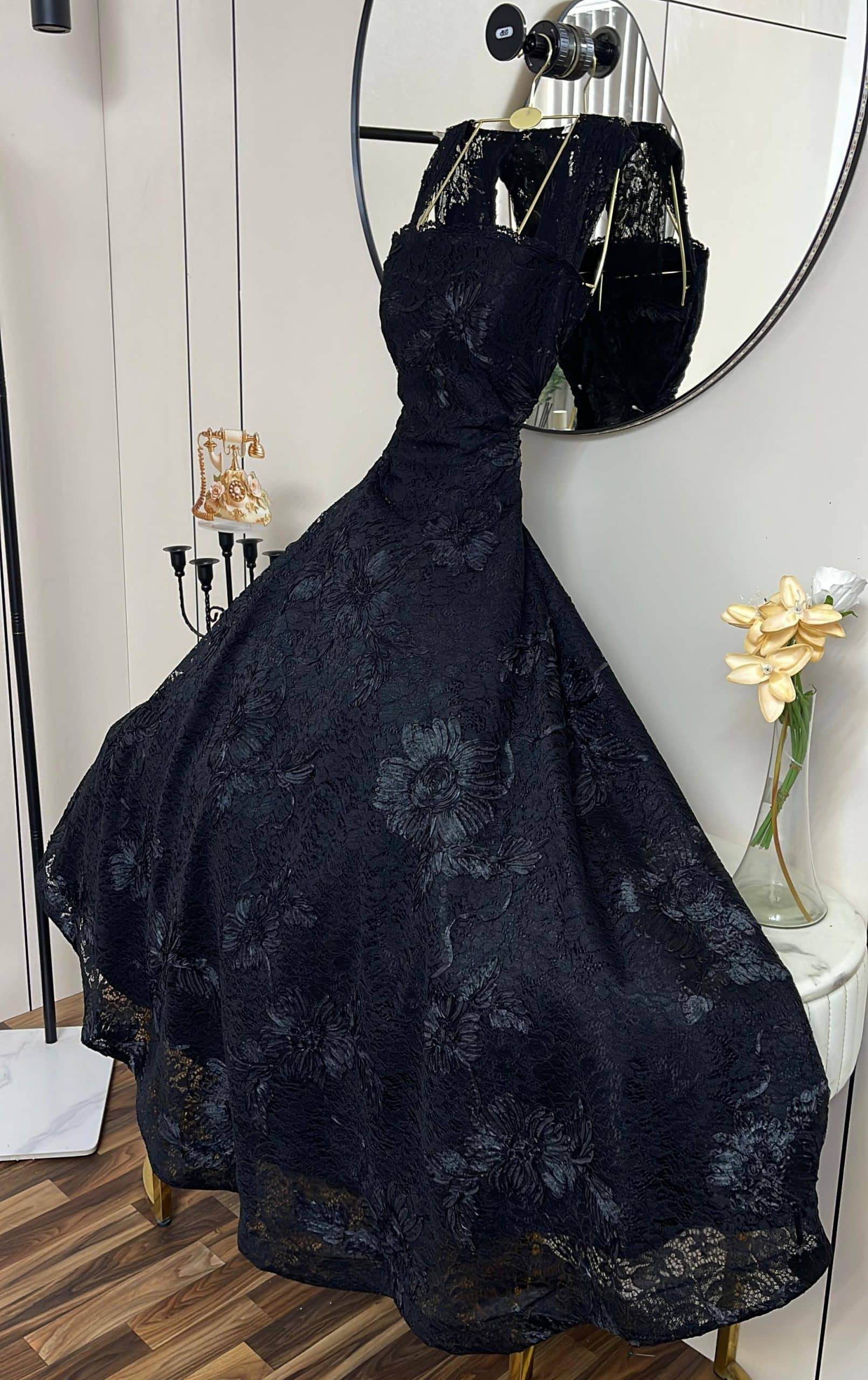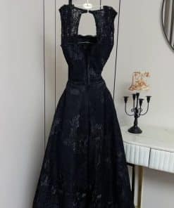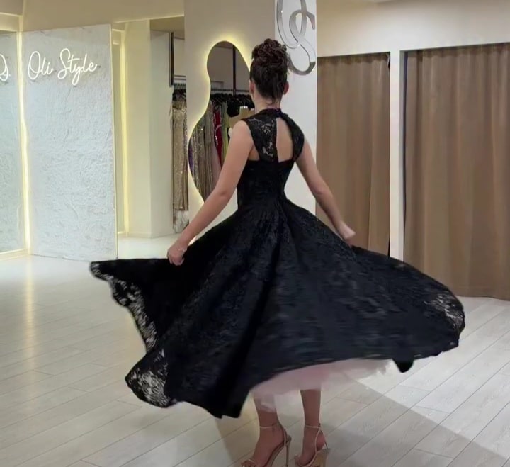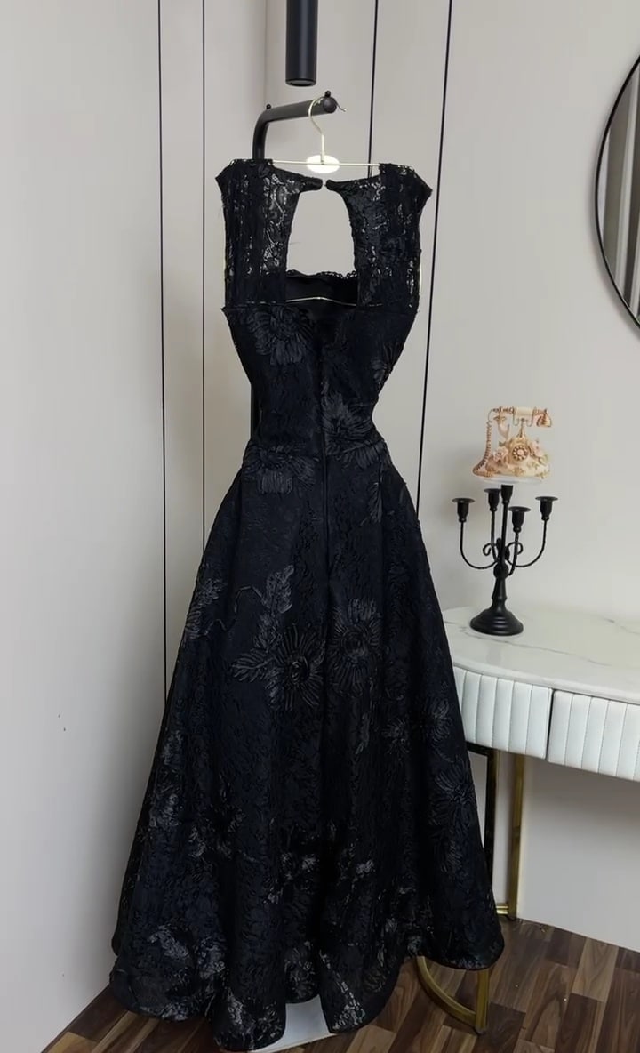 فستان سهرة أسود منفوش دانتيل بتصميم ملكي أنيق