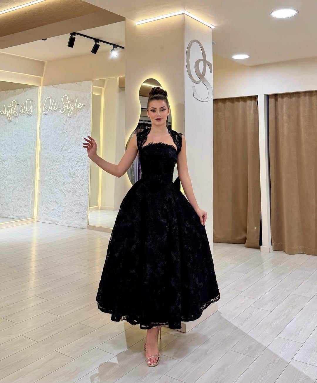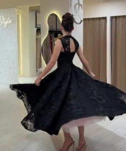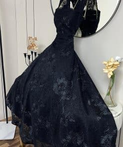 فستان سهرة فاخر باللون الأسود بتصميم منفوش أنيق وقصة ملكية تبرز القوام بشكل راقٍ. مصنوع من قماش الدانتيل الفخم مع تفاصيل ناعمة عند الأكتاف تضيف لمسة أنثوية مميزة، مناسب للحفلات والمناسبات الراقية بإطلالة كلاسيكية جذابة.