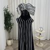 فستان سهرة أسود وأبيض بخطوط طولية وتصميم كتف مميز – جرأة وأناقة في قطعة واحدة