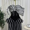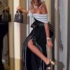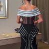 فستان سهرة أسود وأبيض بخطوط طولية وتصميم كتف درامي إطلالة فاخرة وعصرية