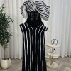 يقدم لكِ متجر روزيتا السعودية هذا الفستان الفريد الذي يجمع بين التفاصيل الجريئة والأناقة الكلاسيكية. يأتي الفستان بتصميم استثنائي يجمع بين لونين راقيين: الأسود والأبيض، مع خطوط طولية تمنح الجسم مظهرًا أنحف وأكثر طولًا.