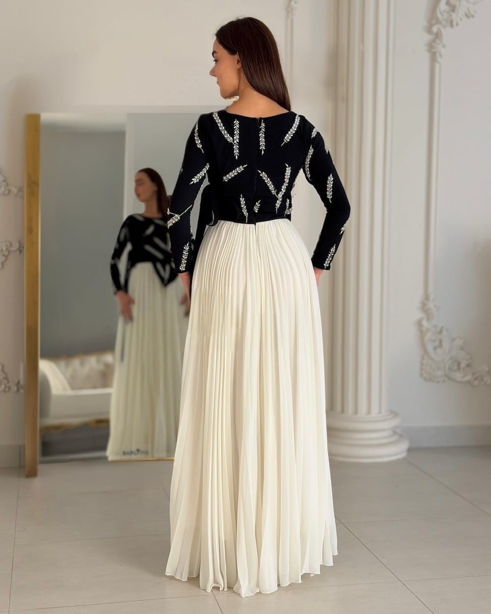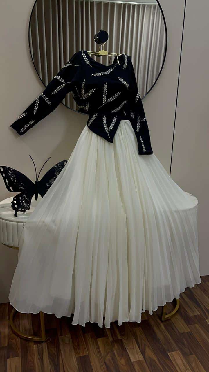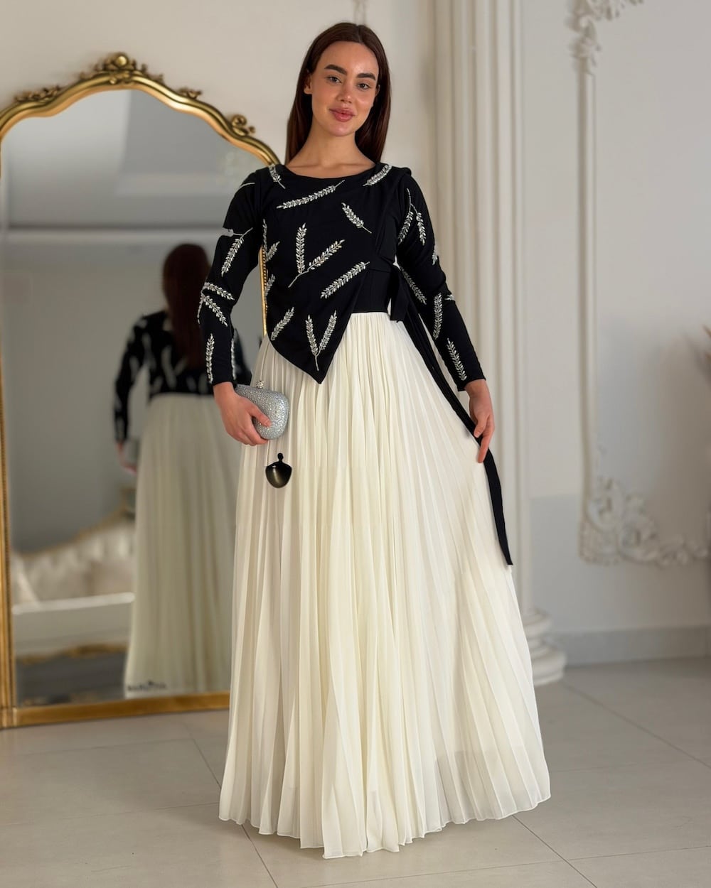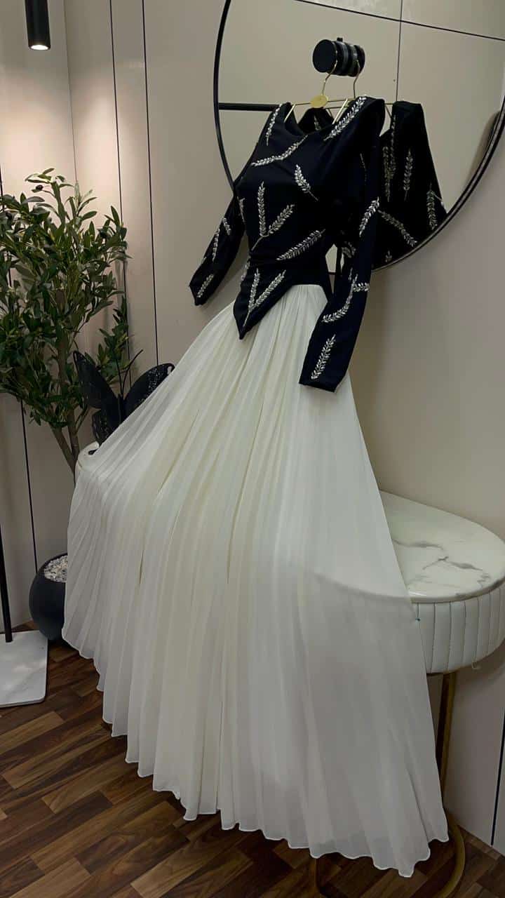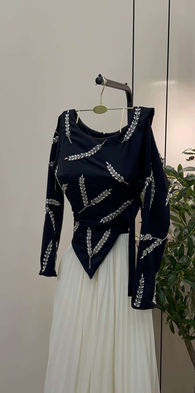 فستان سهرة أنيق يجمع بين اللون الأسود الكلاسيكي وتنورة أوف وايت بطبقات شيفون ناعمة تعطي حركة وانسيابية جذابة. يتميز بتصميم علوي مطرز بنقوش راقية مع أكمام طويلة، ليمنحك إطلالة فخمة ومريحة في المناسبات والسهرات.