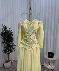 فستان سهرة أصفر أنيق بتفاصيل تطريز