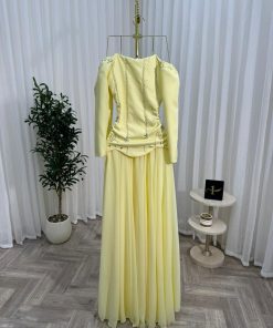 فستان سهرة أصفر أنيق بتفاصيل تطريز من متجر روزيتا السعودية