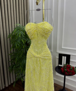 تألقي بإطلالة تخطف الأنظار مع هذا الفستان الأصفر الطويل المصمم بأناقة فائقة. يتميز الفستان بتصميم مكشوف الأكتاف (سترابلس) وقصة ضيقة تبرز جمال القوام، مع تفاصيل ترتر لامع يضفي لمسة فاخرة وبراقة. الفستان مصنوع من قماش دانتيل مزخرف، ويتميز بذيل ناعم يلامس الأرض لمزيد من الرقي. مثالي لحفلات السهرة والمناسبات الفاخرة مثل الخطوبة أو الزفاف أو حفلات التخرج