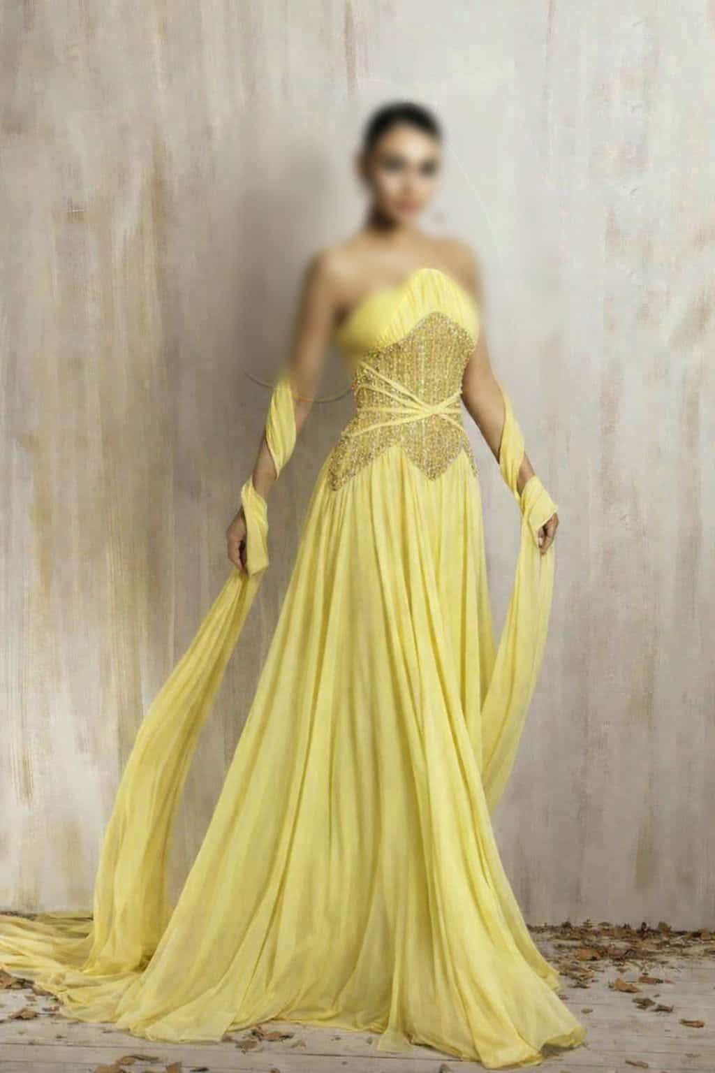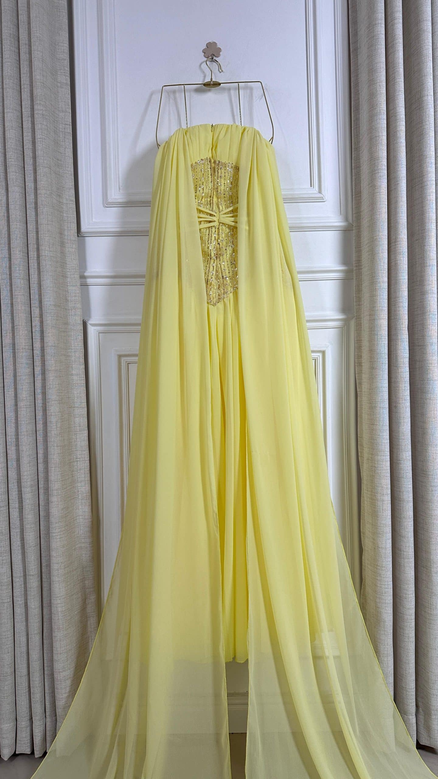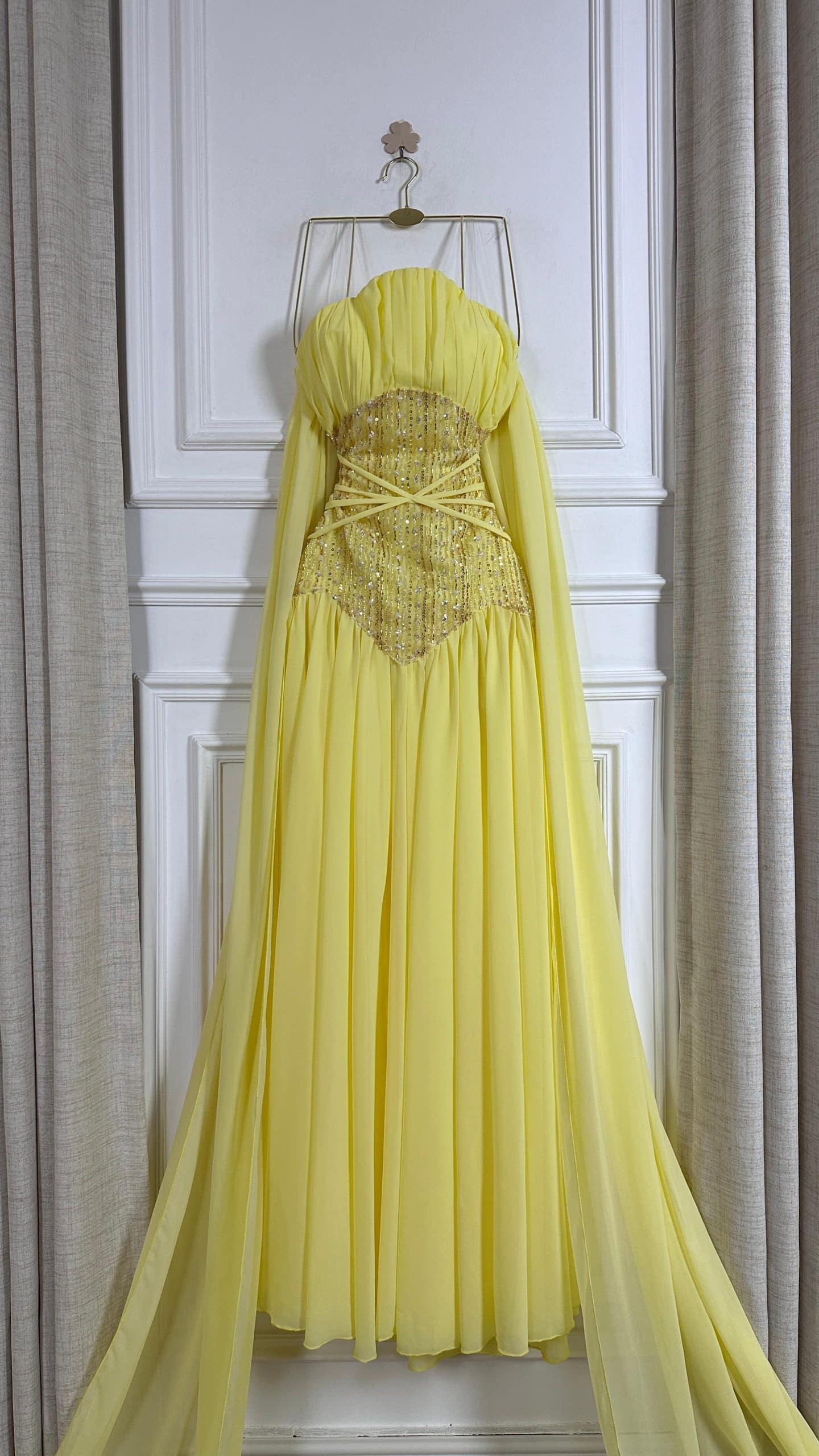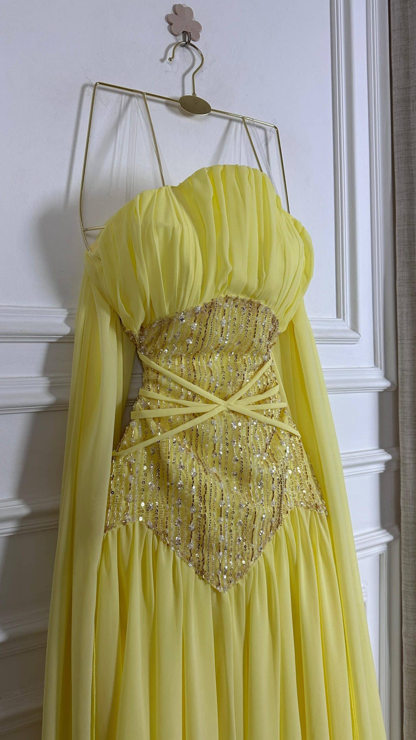 فستان سهرة أصفر فاخر بقصة انسيابية وتطريز لامع