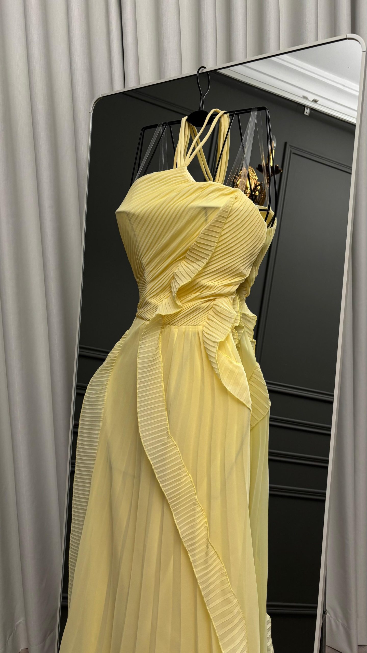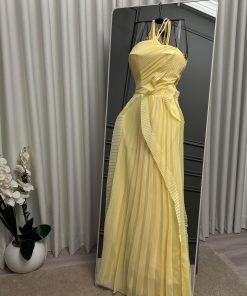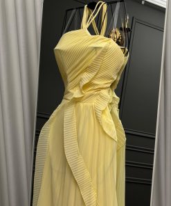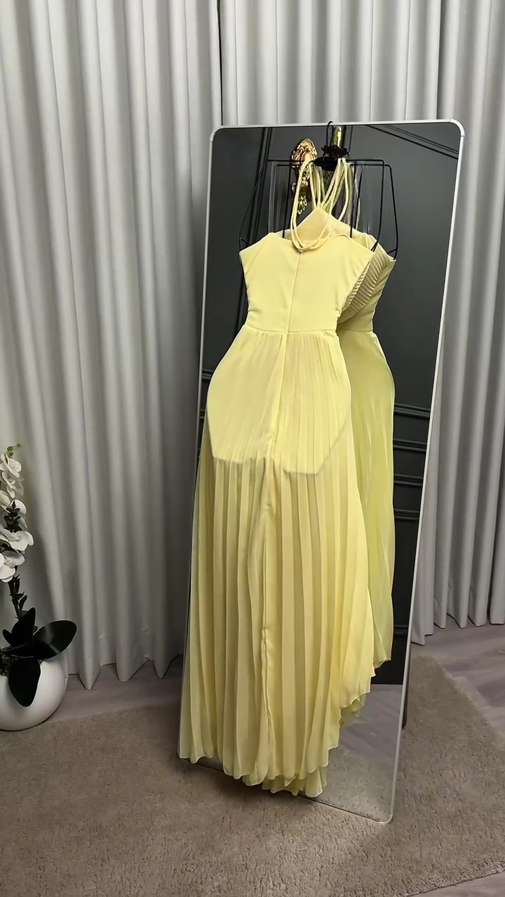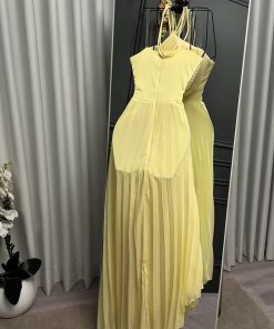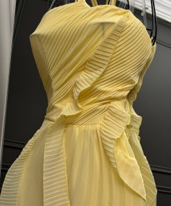 فستان سهرة أصفر هالتر بطبقات كشكش وشق جانبي أنيق