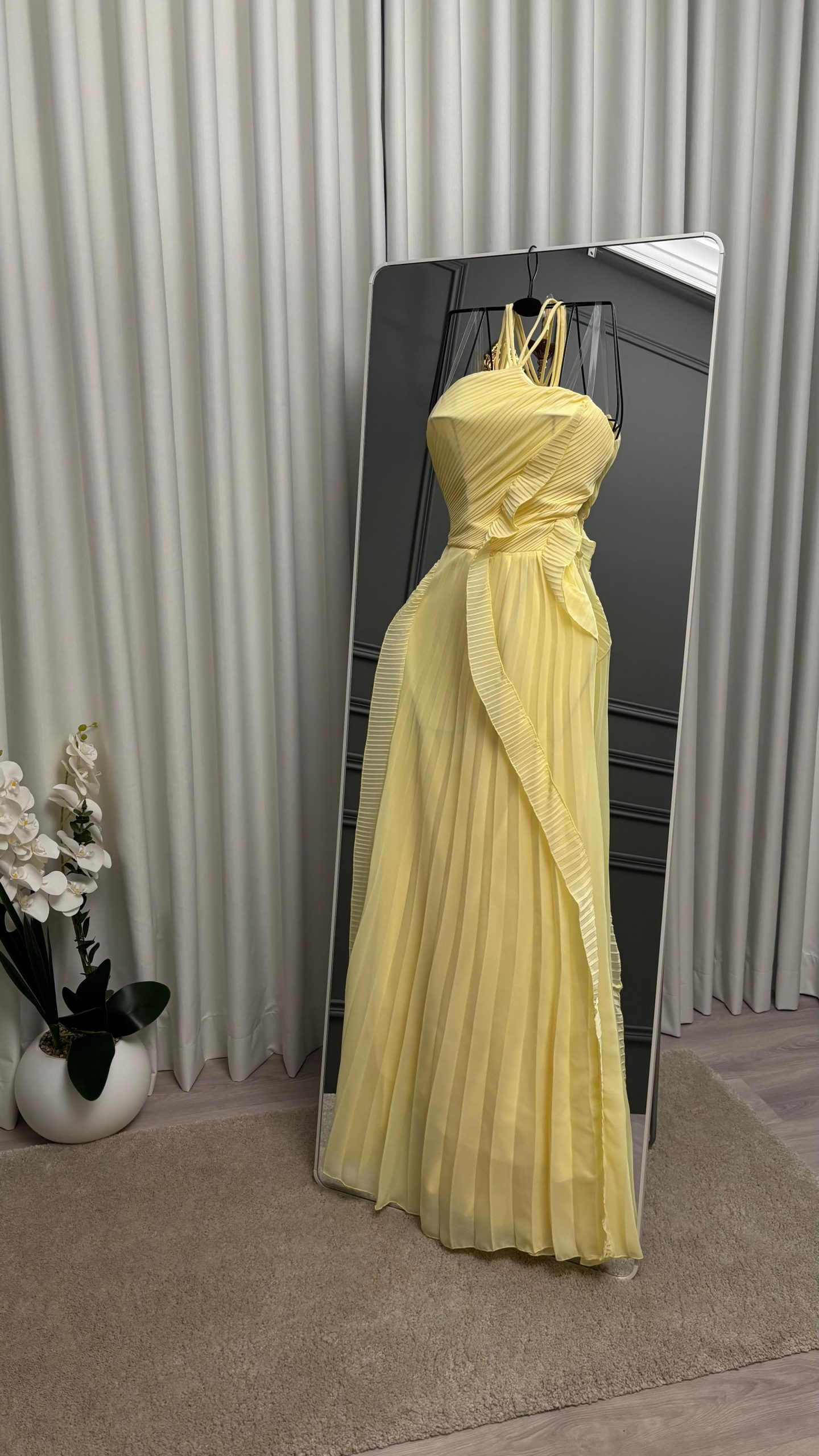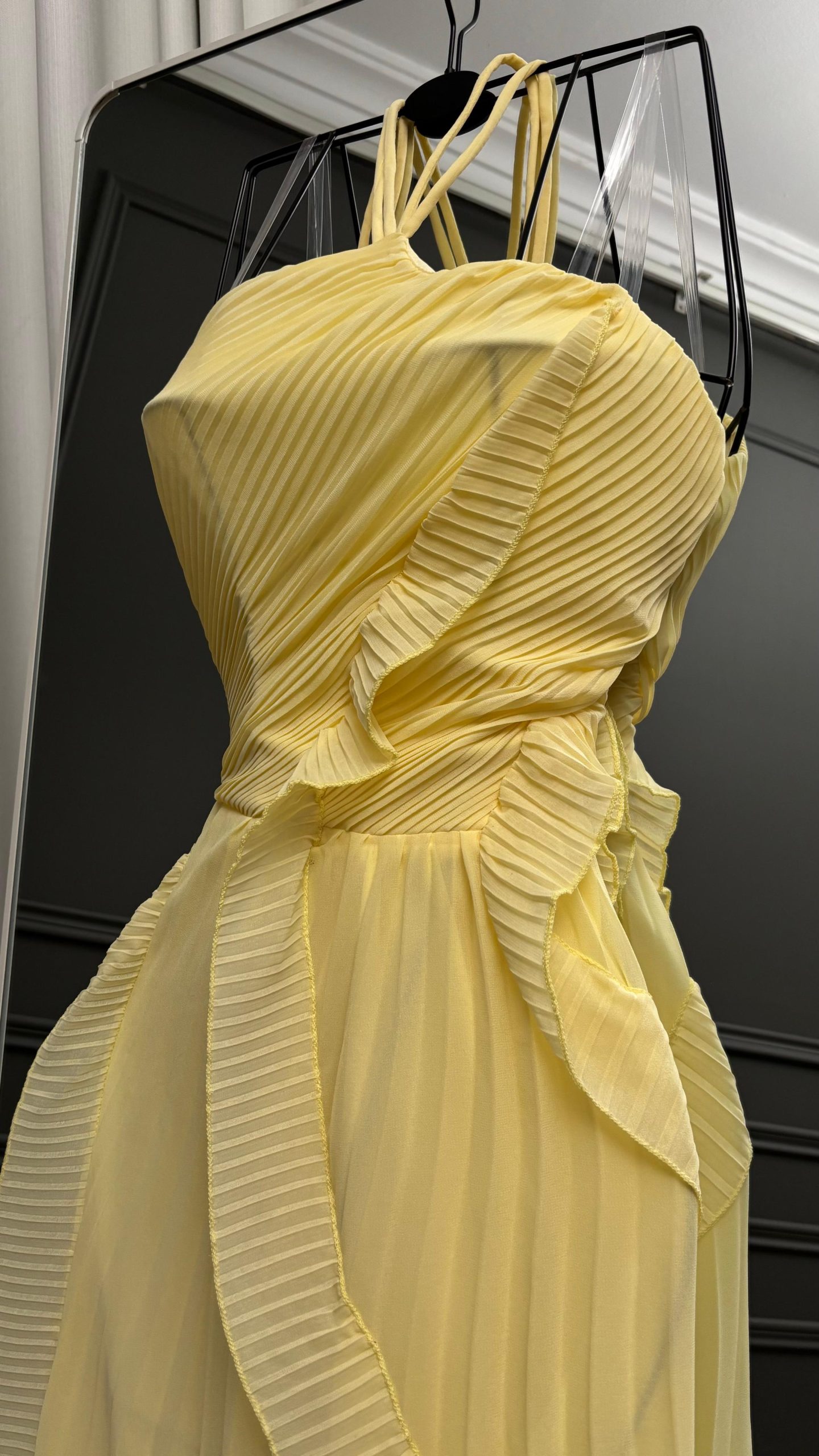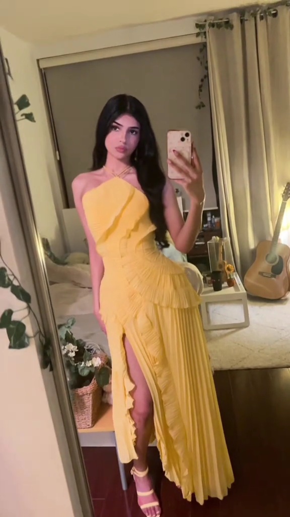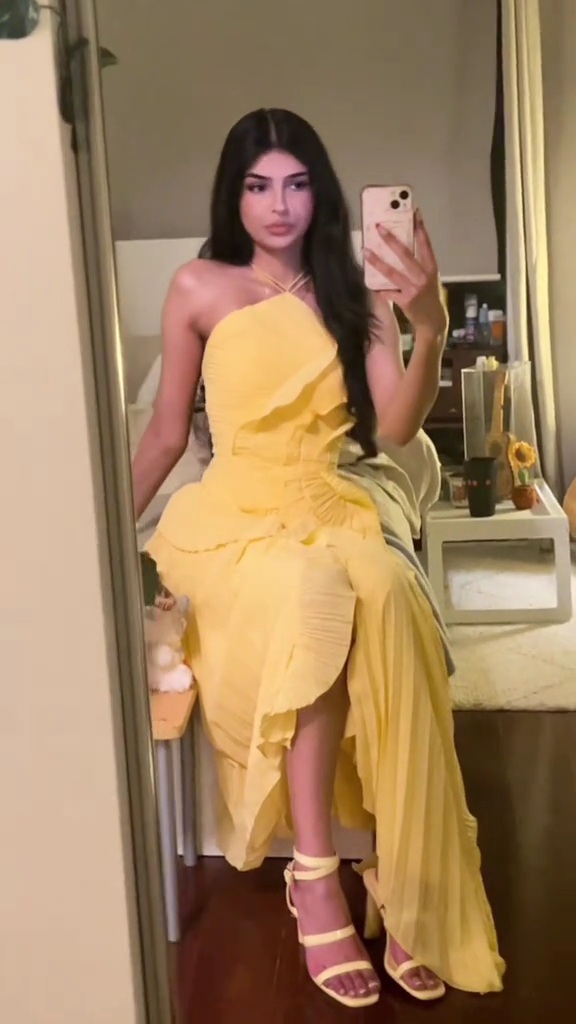 فستان سهرة أنثوي باللون الأصفر المشرق، بتصميم هالتر جذاب وطبقات كشكش ناعمة تضيف حركة وأناقة، مع شق جانبي يمنح لمسة جريئة وراقية لإطلالة مميزة في المناسبات والحفلات.