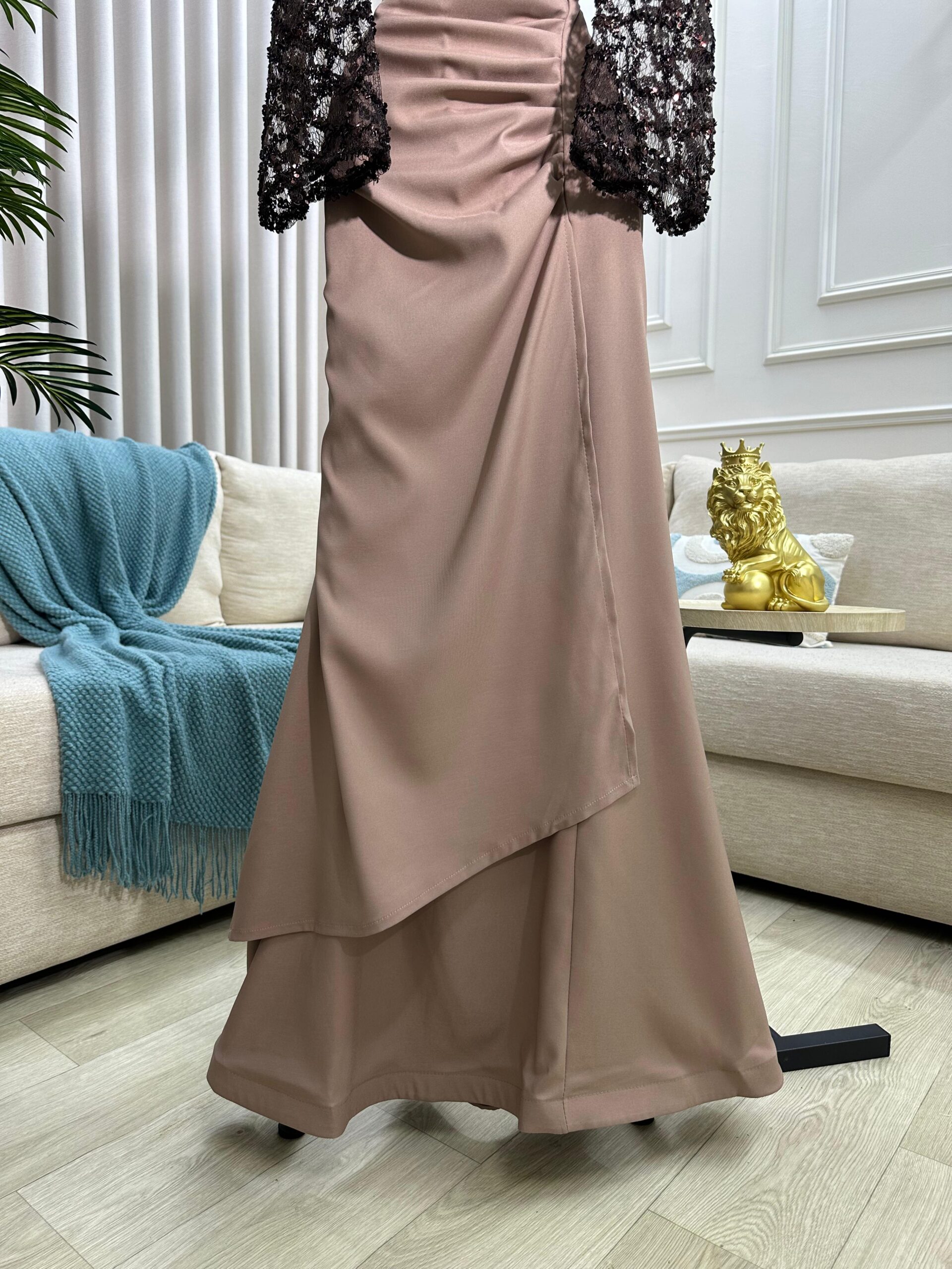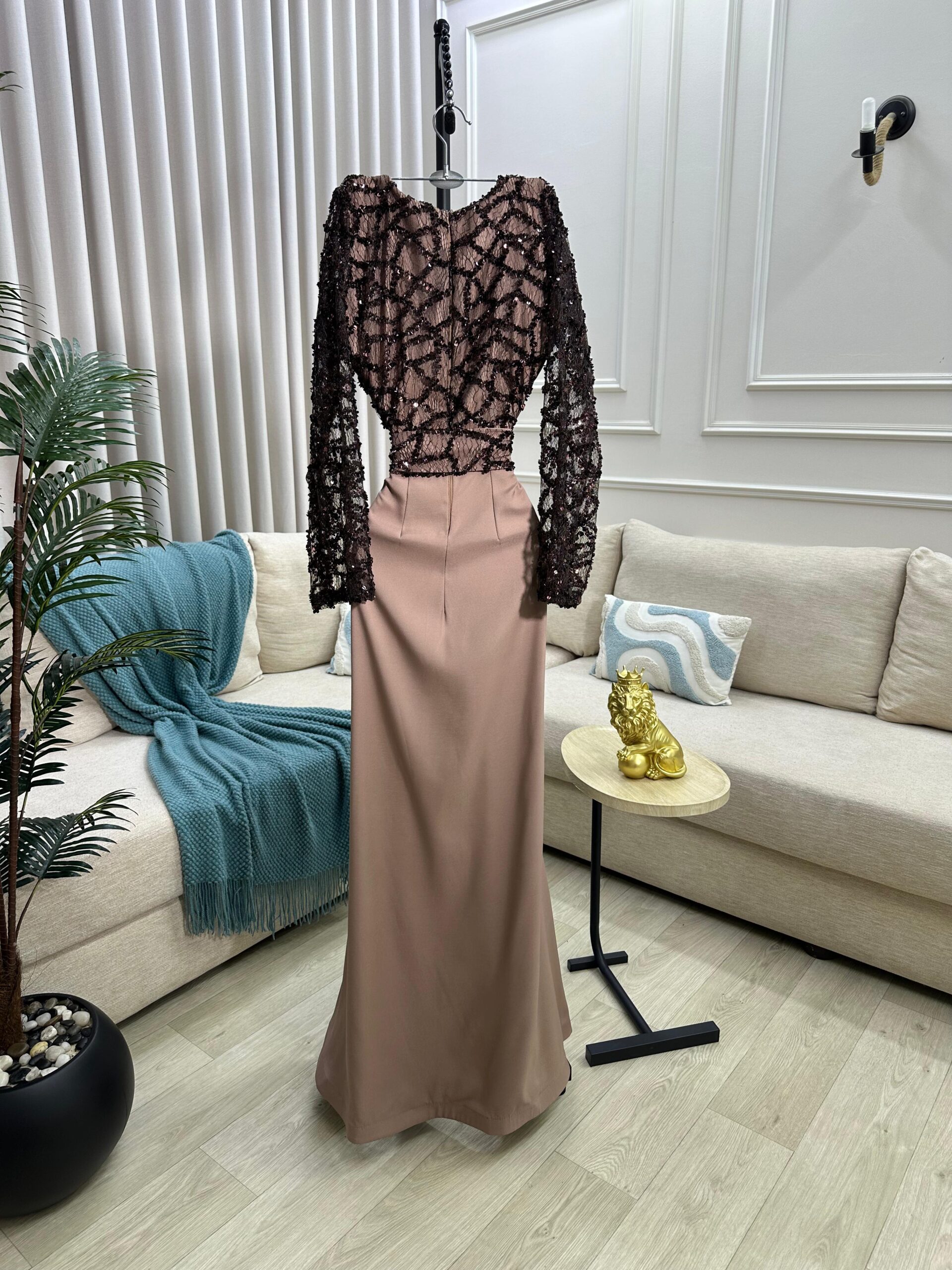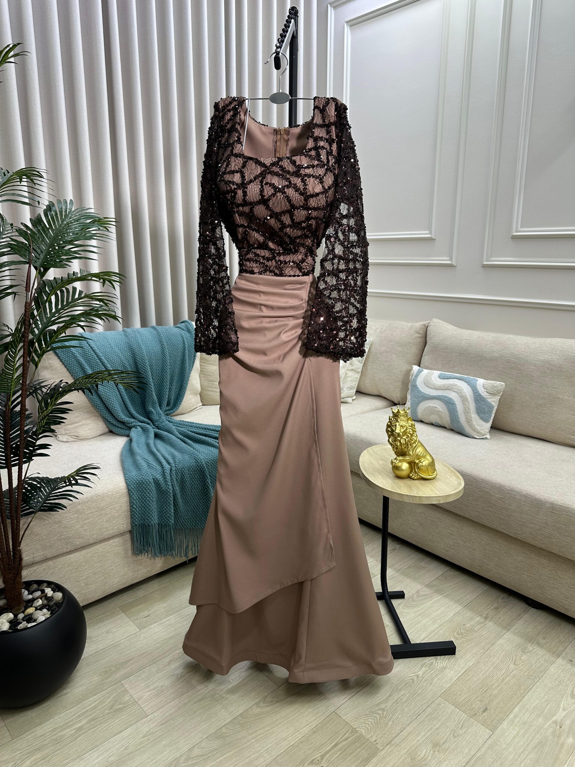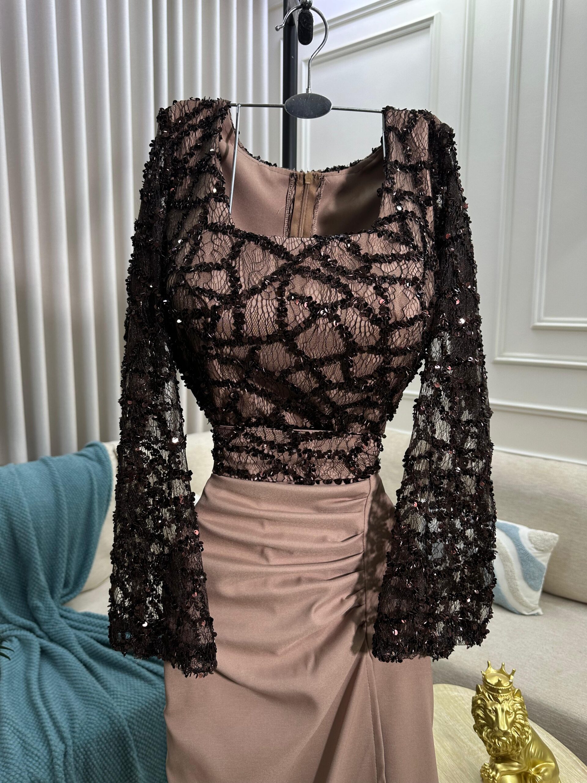 إذا كنتِ تبحثين عن فستان سهرة أنيق يجمع بين الفخامة والأنوثة الراقية، فهذا التصميم بلون الشوكولا هو الخيار الأمثل لكِ. يتميز بتفاصيل دقيقة وتصميم مميز يبرز جمال القوام ويمنحكِ حضورًا لافتًا في كل مناسبة. هذا الفستان الطويل يدمج بين الدانتيل الفاخر والقصّة الانسيابية ليعكس ذوقكِ الرفيع في اختيار الأزياء.