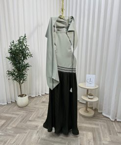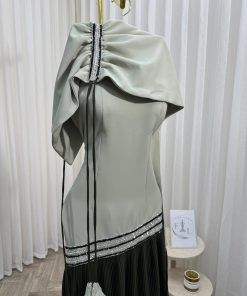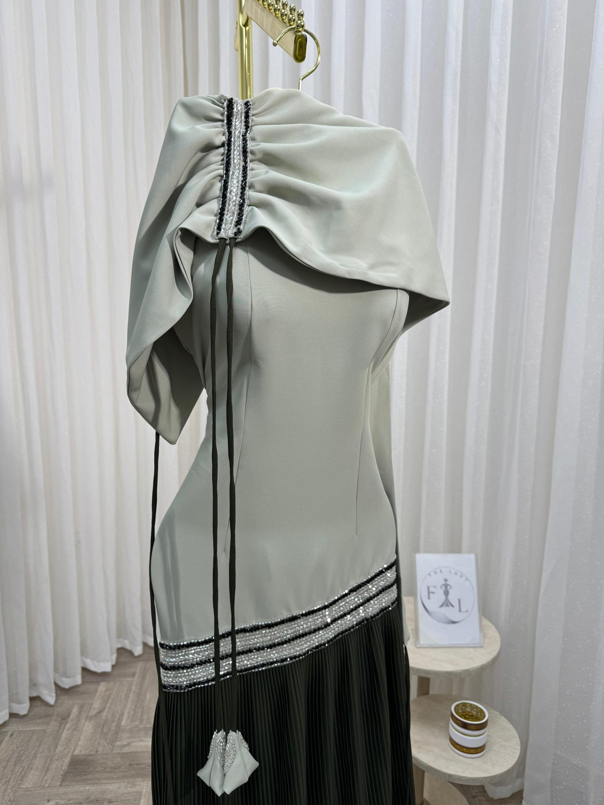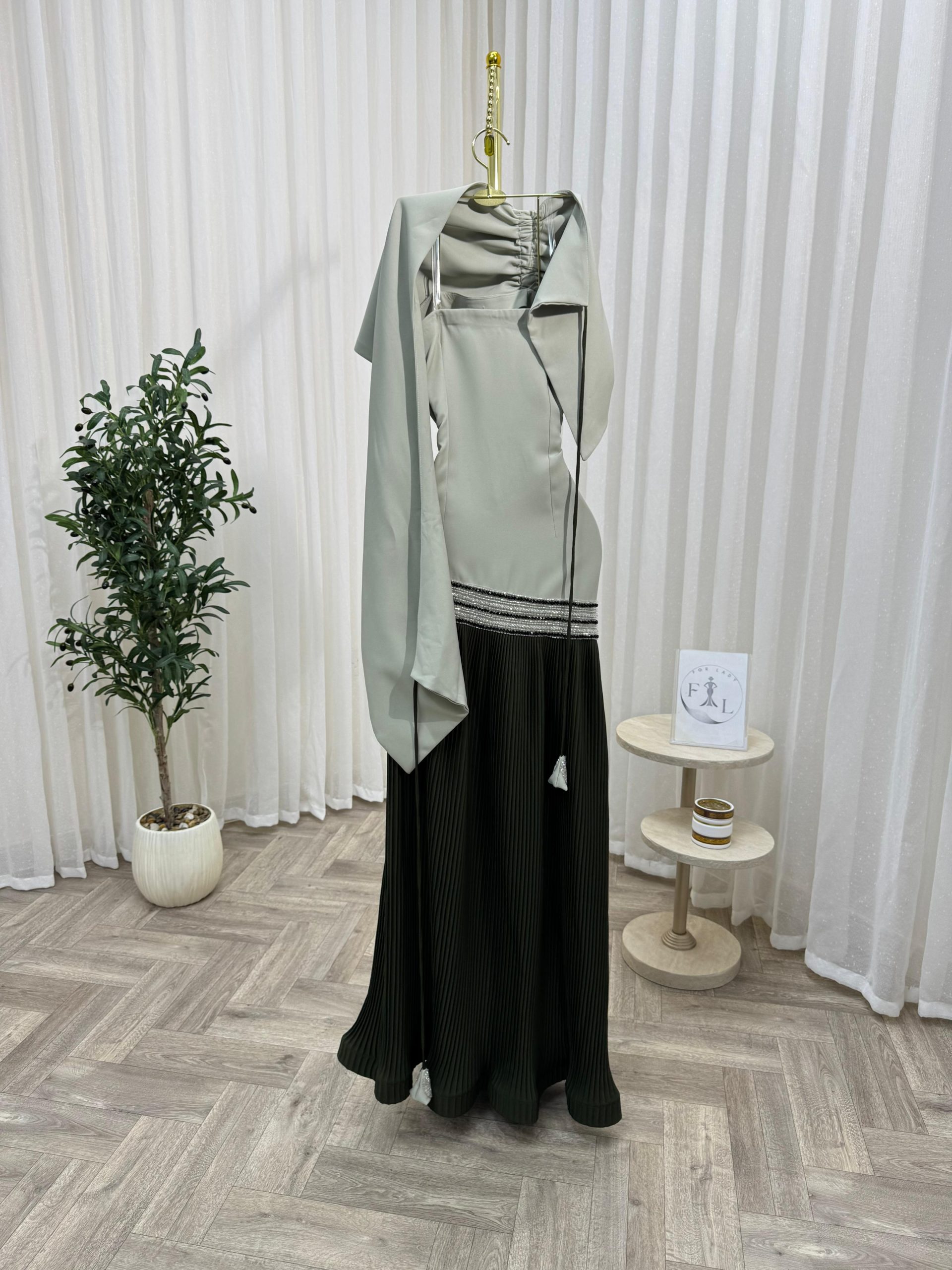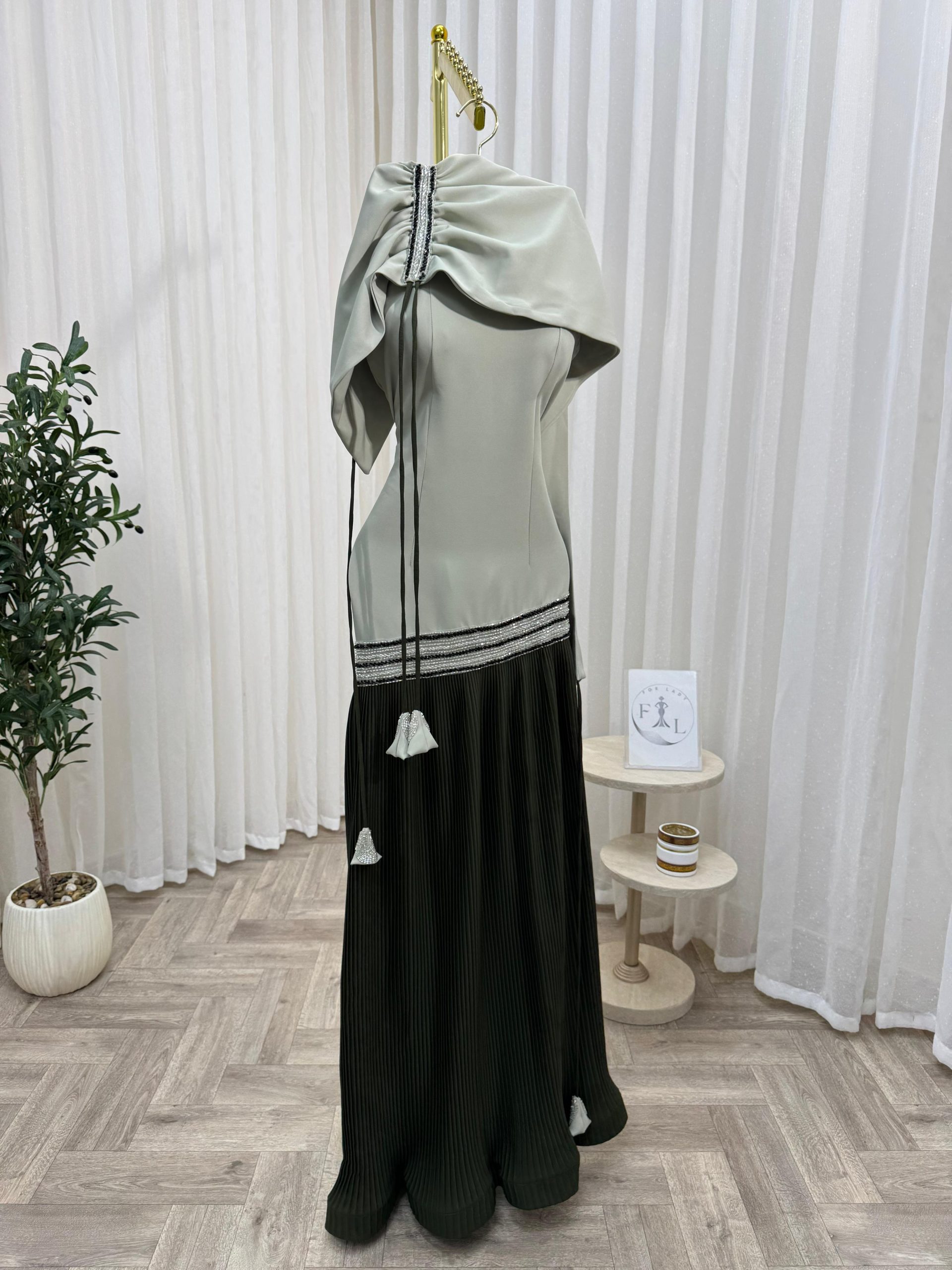 فستان سهرة راقٍ بتصميم يجمع بين النعومة والفخامة، يتميز بجزء علوي بلون رمادي فاتح مع تفاصيل أنثوية أنيقة، وتنورة سوداء بطيات فاخرة تضيف لمسة من الانسيابية والرقي. تصميم مثالي للمناسبات الخاصة والسهرات، يمنحك إطلالة جذابة ومميزة تعكس الأناقة والثقة.
