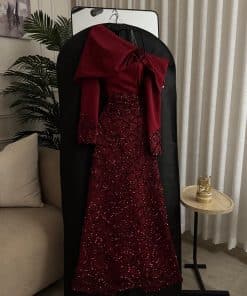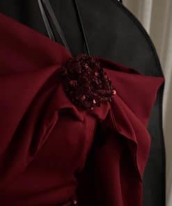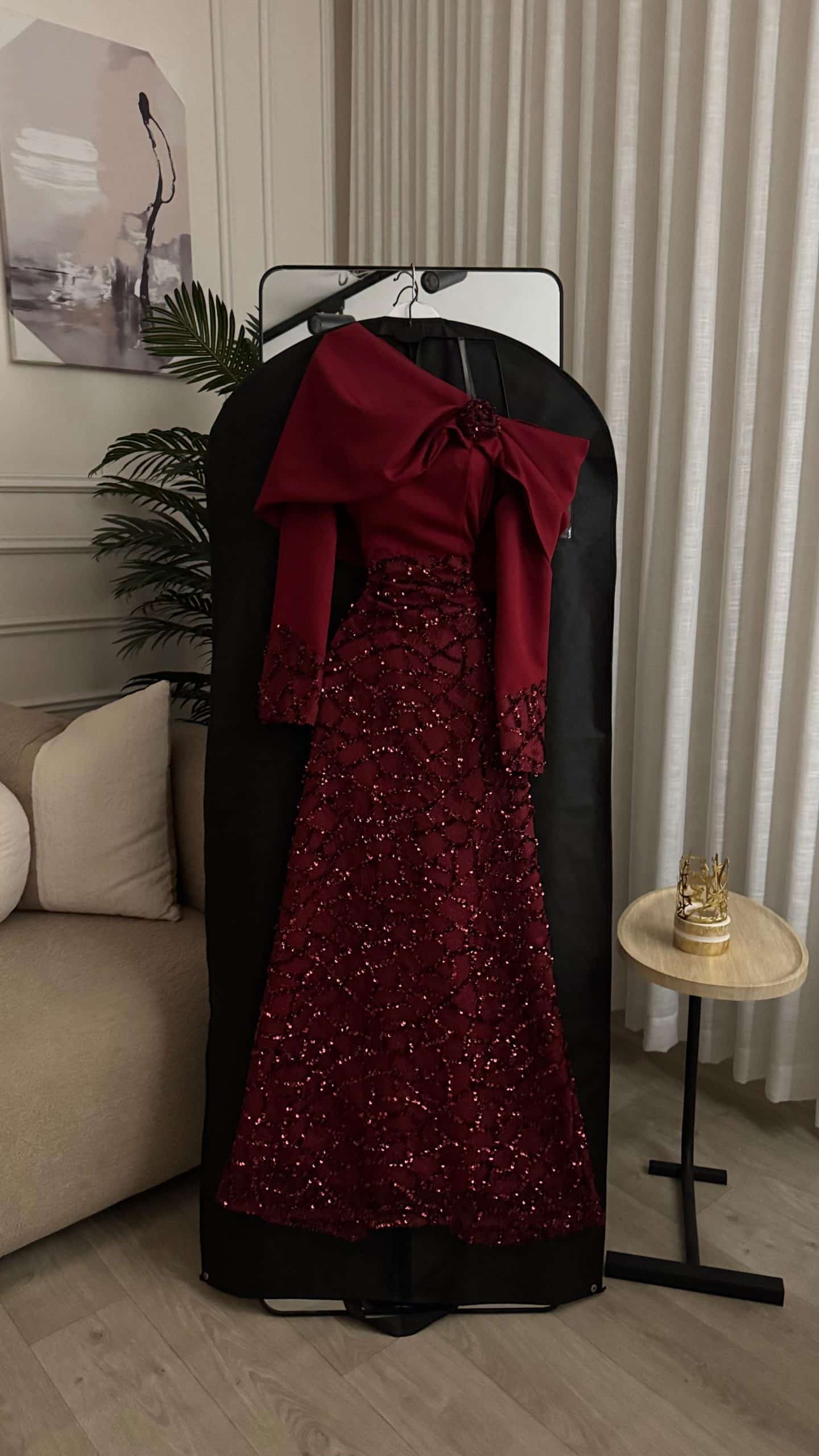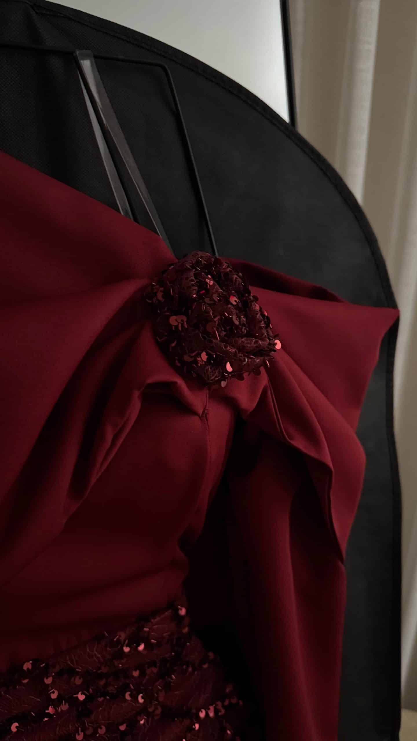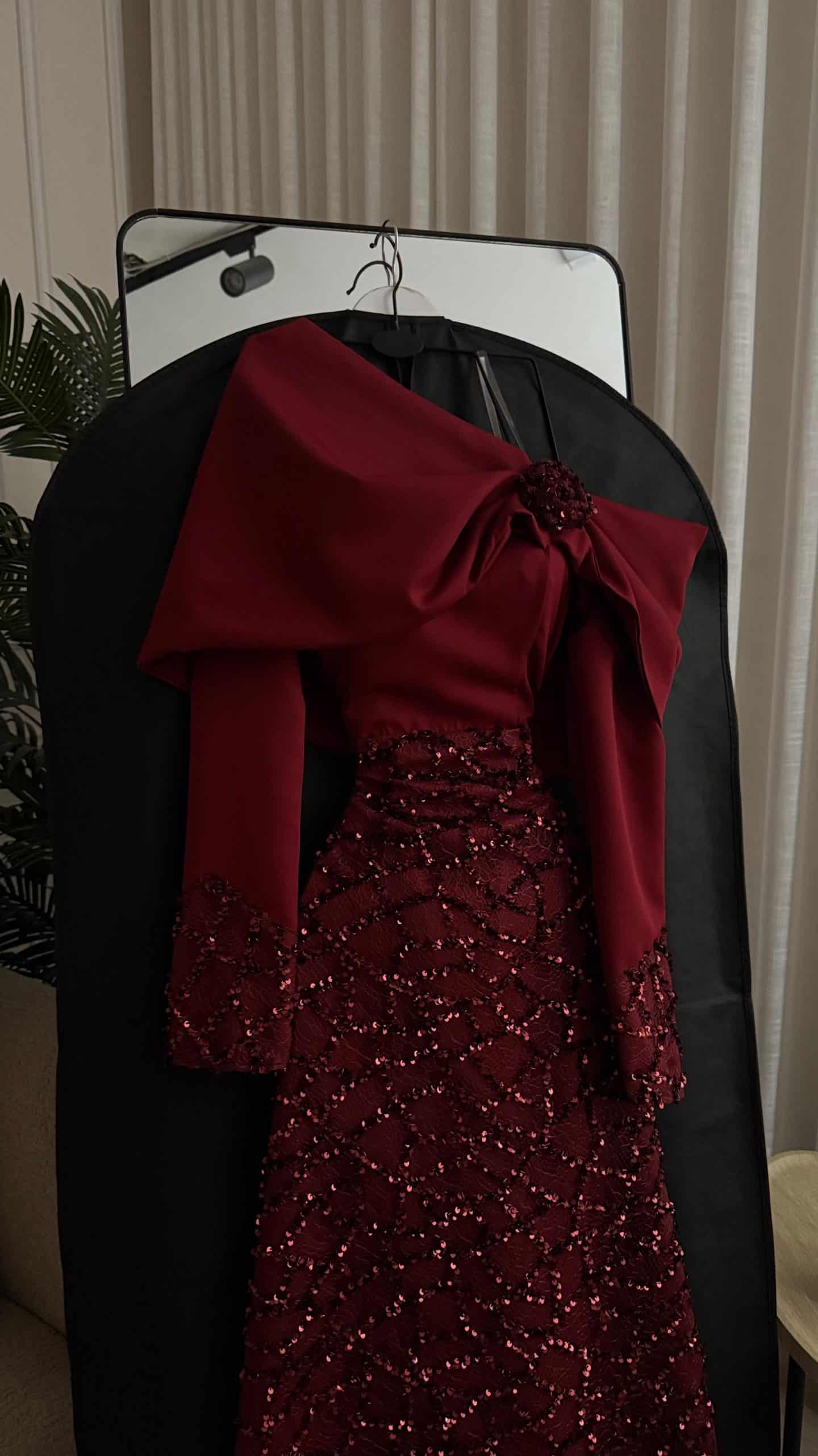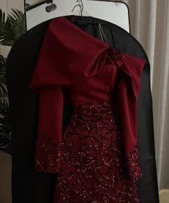 فستان سهرة احمر أنيق أوف شولدر مطرز بالترتر
