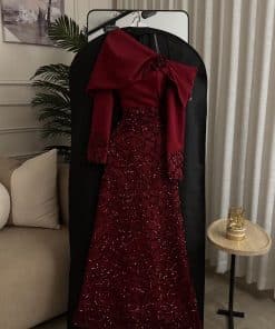 فستان سهرة فاخر باللون أحمر بتصميم أوف شولدر أنيق يبرز جمال الكتفين، مزين بتطريز ترتر لامع يضيف لمسة فخامة جذابة. قصة مستقيمة ناعمة تناسب السهرات والمناسبات الخاصة بإطلالة أنثوية راقية.