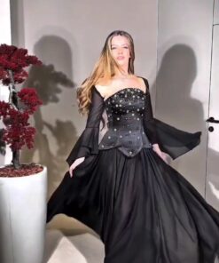 ويأتي هذا الاختلاف باللون الأسود يعكس التتبع والغموض، ومصمم بقماش شفاف على الأكمام والصدر يسمح بإطلالة مذهلة دون التعبير عن الهوية. يتميز الجزء العلوي من القماش بتطريزات لامعة على شكل ورود أو نجوم صغيرة تغطي منطقة الصدر، ما يضفي لمسة براقة وأناقة فريدة.