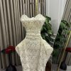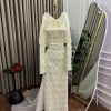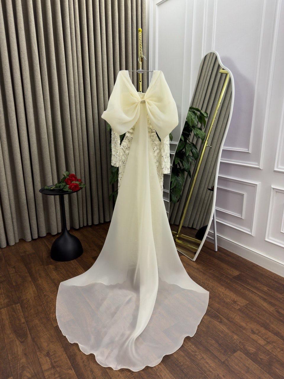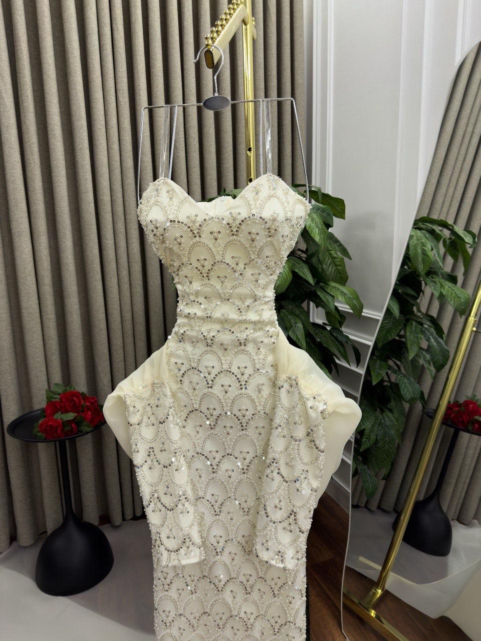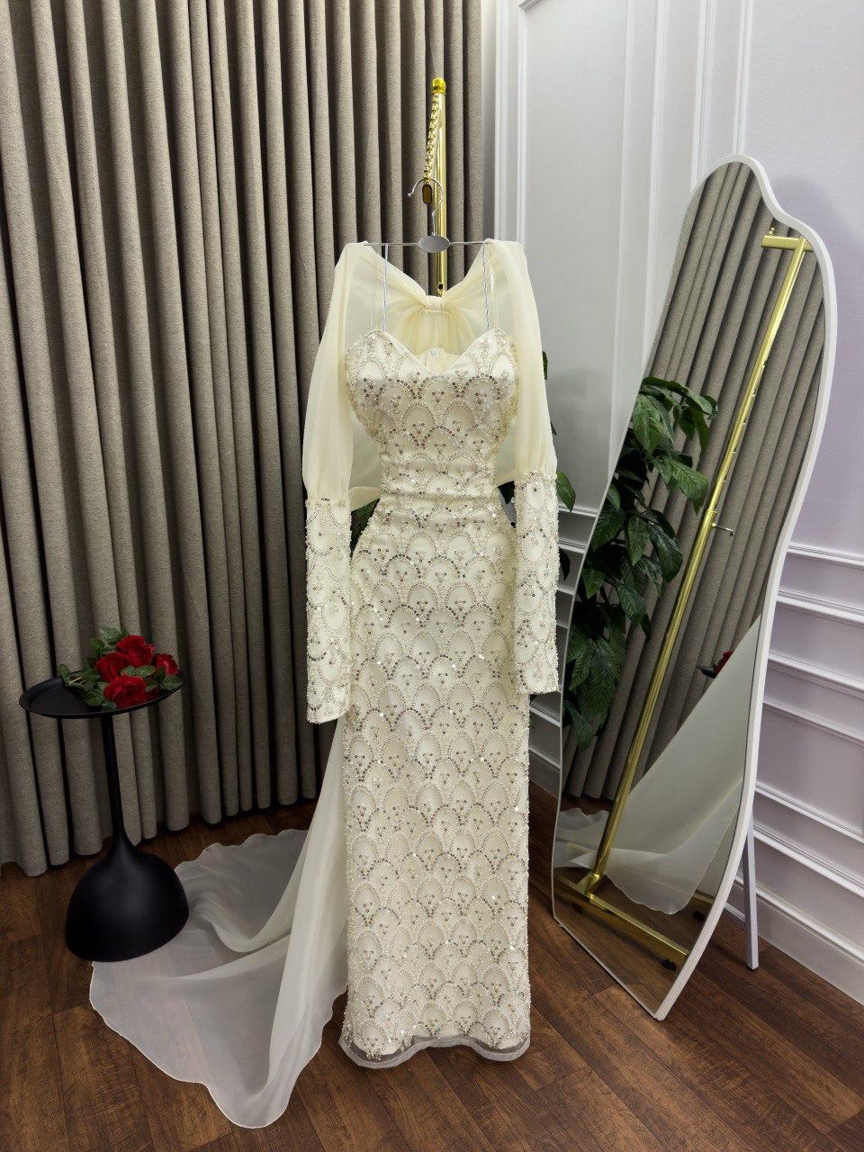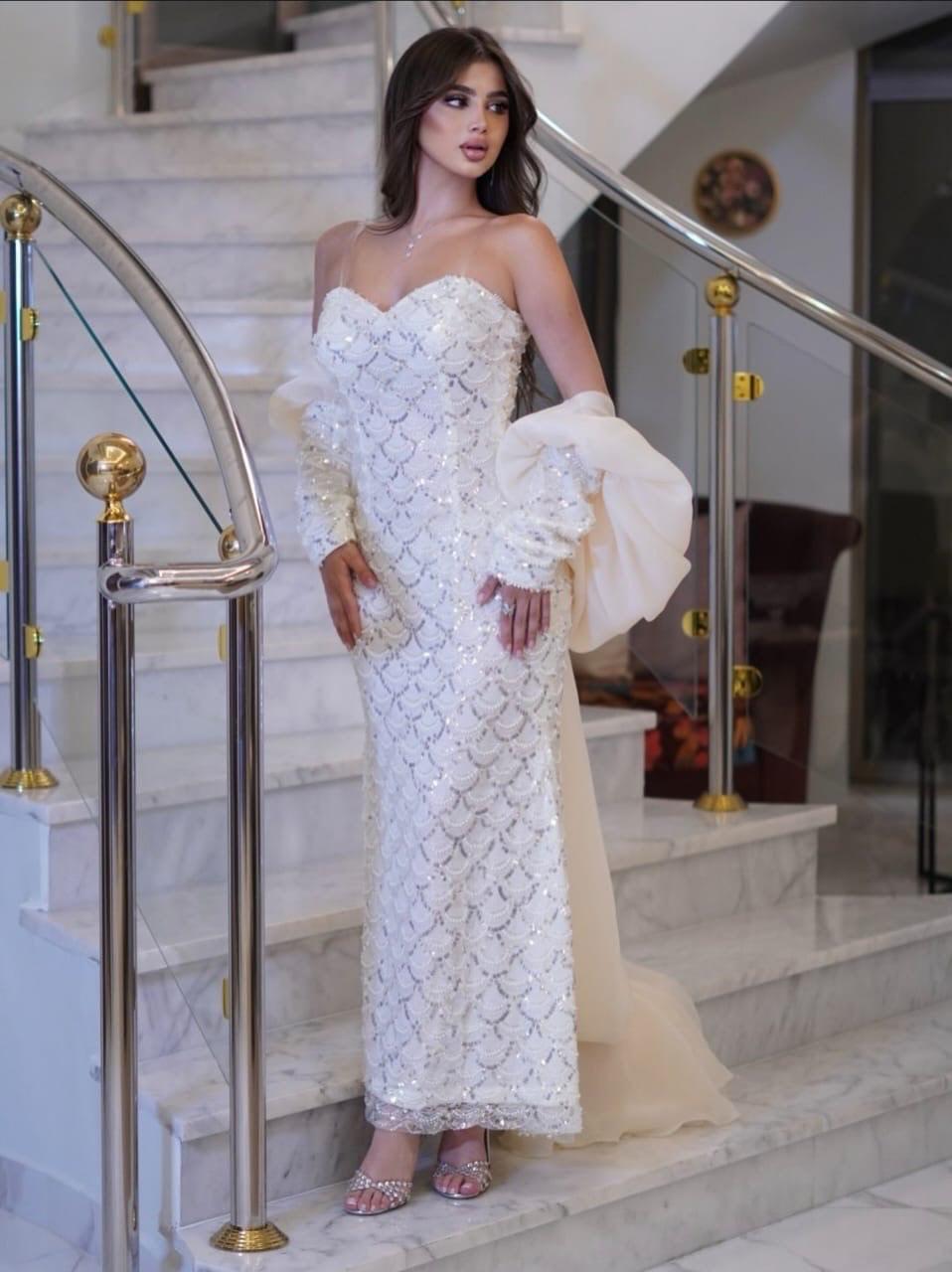 فستان سهرة بذيل طويل بتطريز لامع وتصميم أنثوي فاخر
