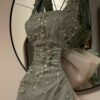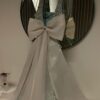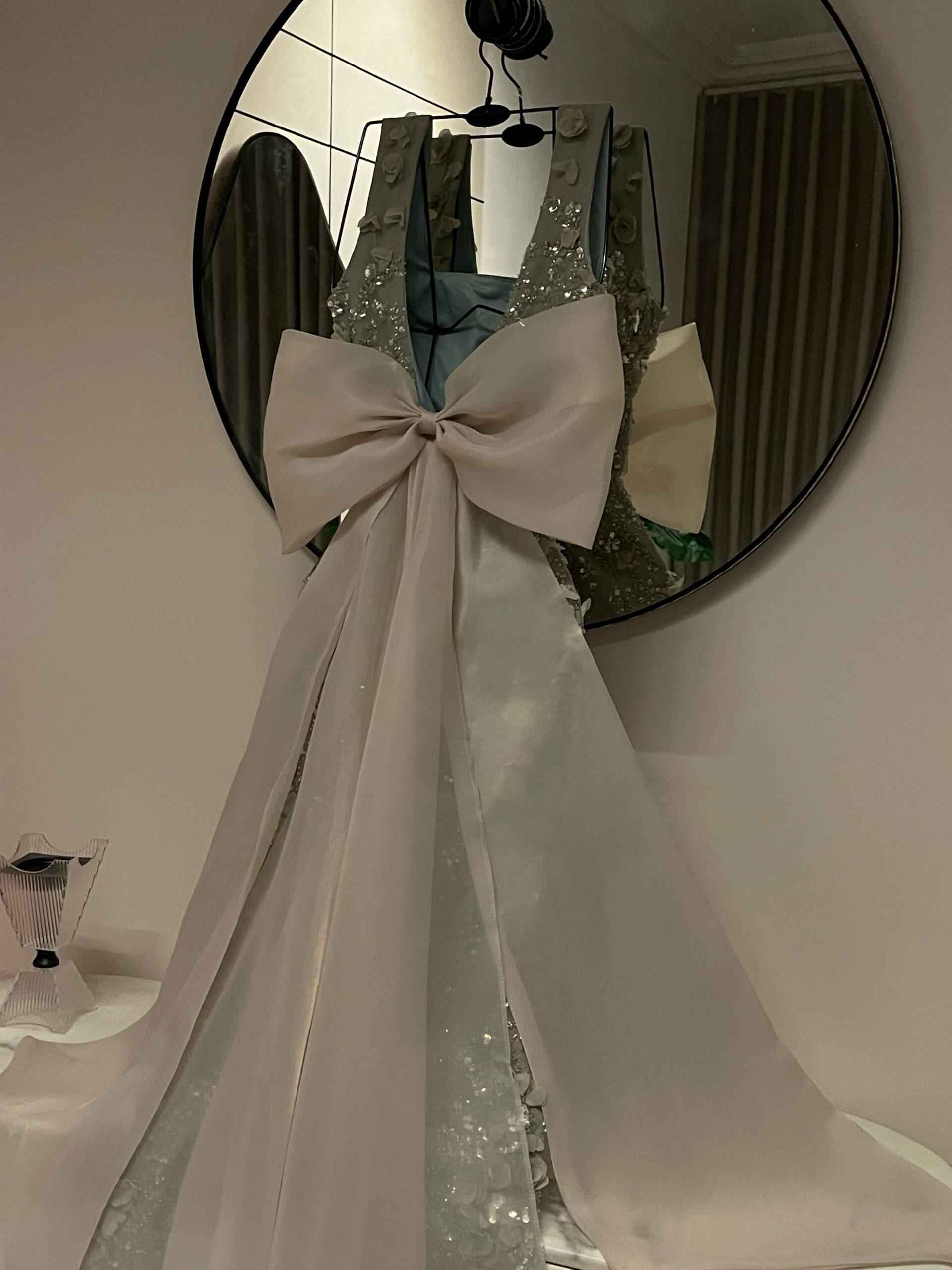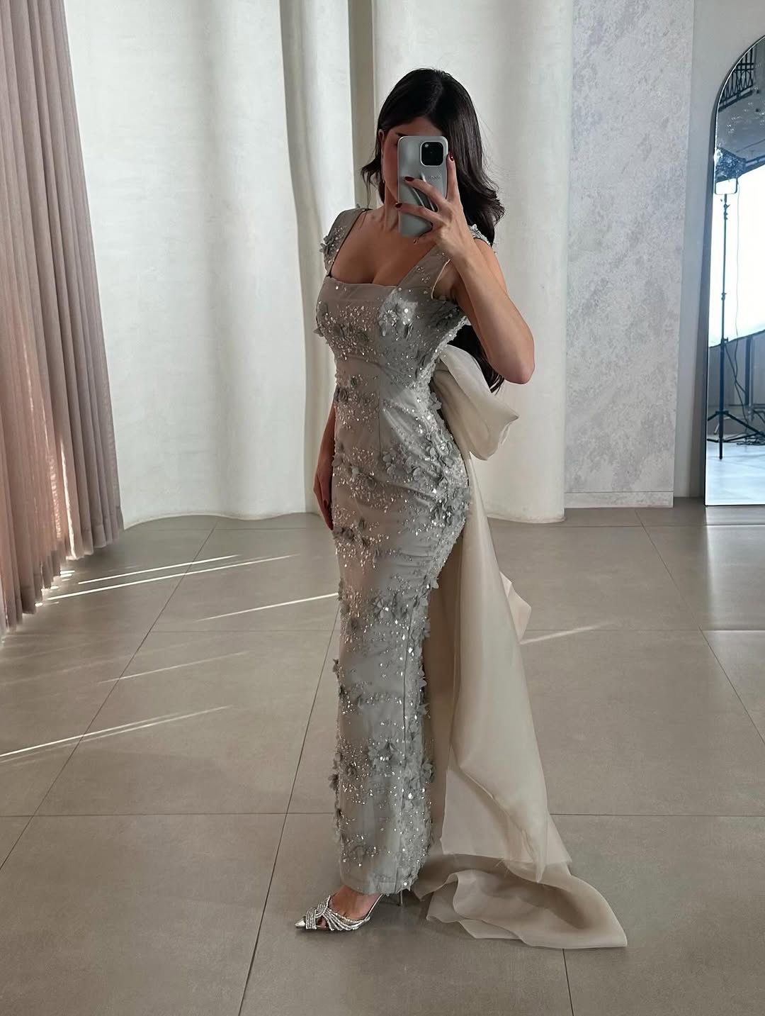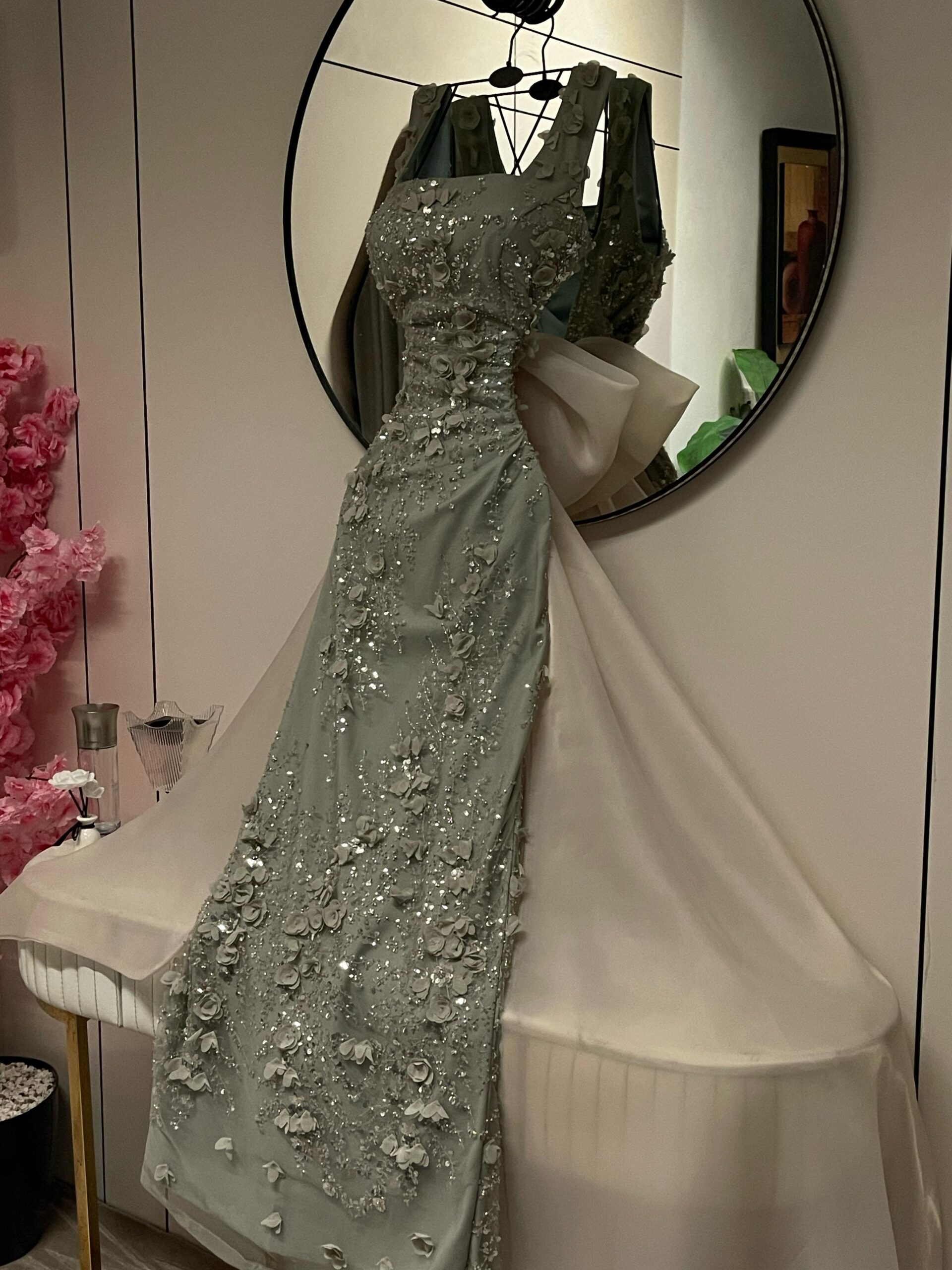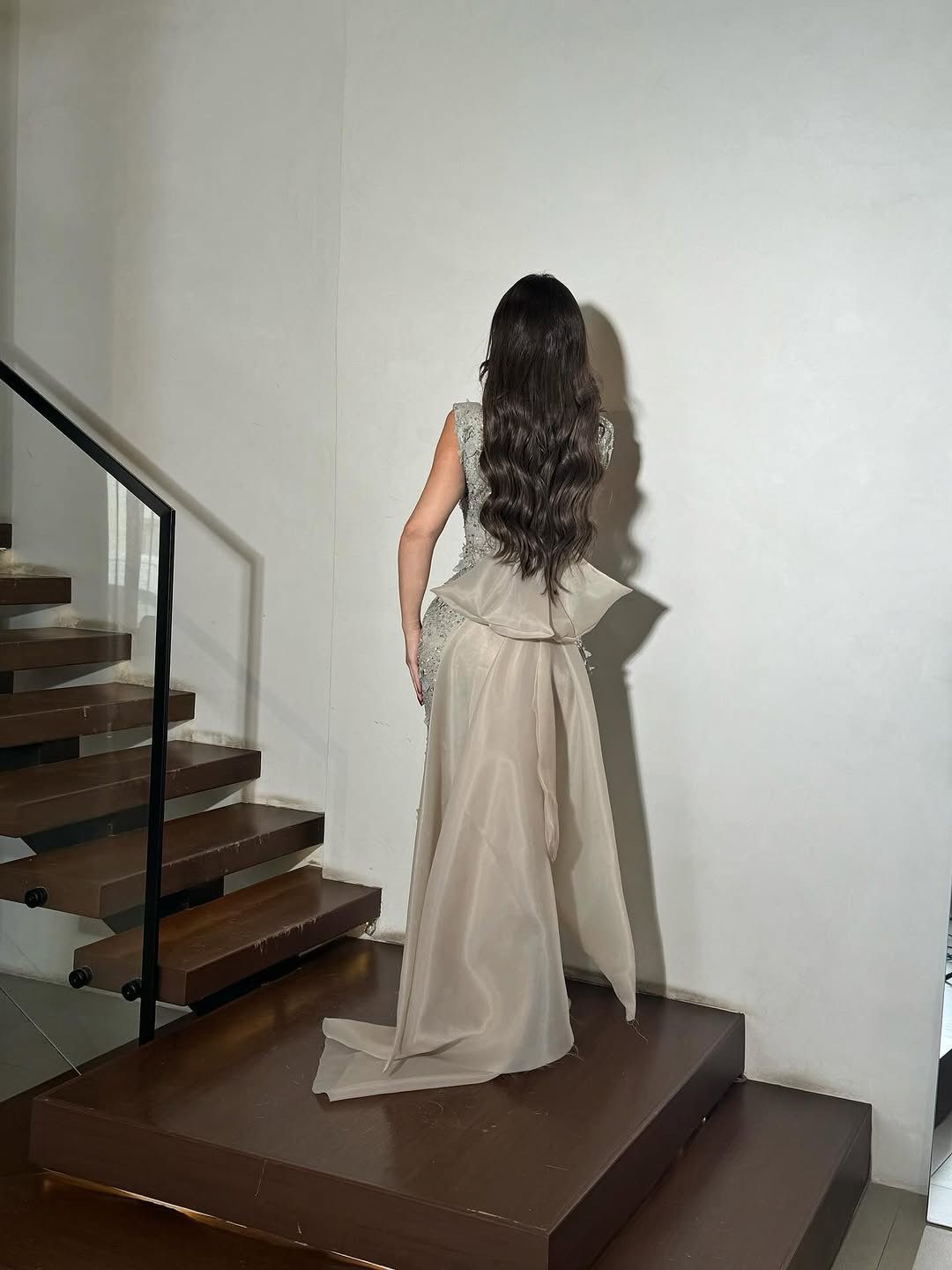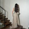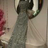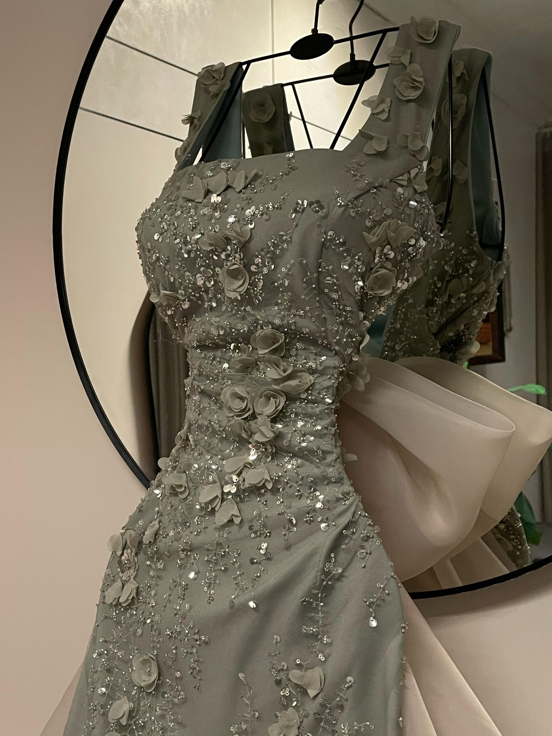يتميز الفستان بتصميم راقٍ يجمع بين القصّة الكلاسيكية واللمسات العصرية. القماش الهادئ المطرّز بالخرز والكريستالات اللامعة يضفي إشراقة ناعمة تحت الإضاءة، بينما تزينه ورود ثلاثية الأبعاد تمنحه بعدًا فنيًا رائعًا يجعل من كل إطلالة لوحة فنية متكاملة.