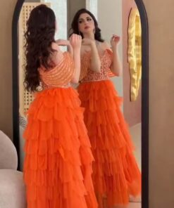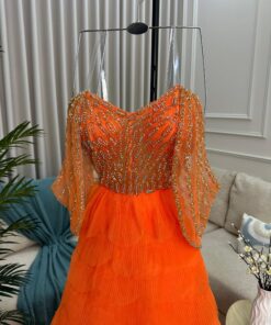 امنحي إطلالتك لمسة من التميز مع فستان سهرة برتقالي فاخر بتصميم مدهش يجمع بين الرقي والفخامة. يتميز الفستان بأكمام واسعة شفافة مزينة بتطريزات براقة أنيقة تضيف لمسة فاخرة لجزء الصدر، بالإضافة إلى تصميم الطبقات المتدرجة الذي يمنح الفستان حركة انسيابية ساحرة.